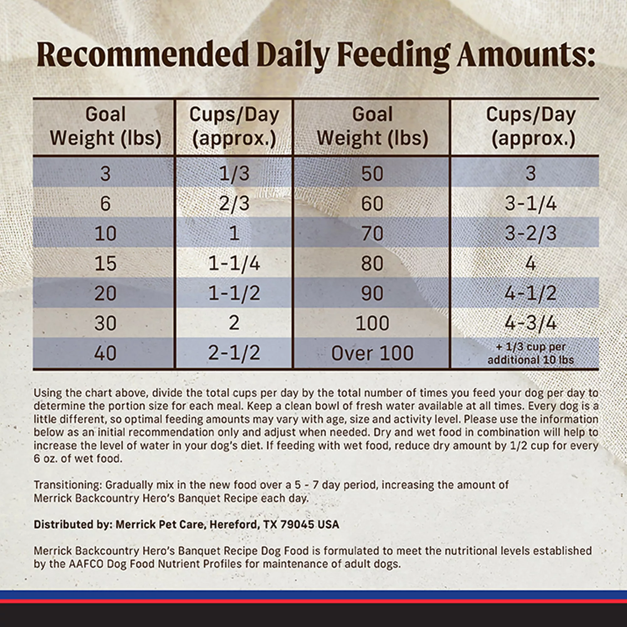Description: Salute a hero when you serve Merrick Backcountry Grain Free Dog Food, Hero’s Banquet Recipe. Hero’s Banquet dry dog food celebrates and calls attention to the work of our partner K9s For Warriors. Real deboned beef is the first ingredient in this natural, with added vitamins, minerals, and nutrients recipe, a high protein dog food that helps maintain lean muscle mass and energy levels. This real meat dog food contains a holistic blend of kibble and freeze-dried raw pieces inspired by an ancestral canine diet and is crafted to provide the taste of raw dog food in a convenient recipe. High levels of Omega fatty acids in this premium adult dry dog food nourish your dog’s skin and coat, as well as high levels of glucosamine and chondroitin to support healthy hips and joints. Backcountry Grain Free dog food is gluten free for a wholesome and healthy dog food option. Merrick dog food recipes are proudly founded in Hereford, TX, crafted in USA facilities.