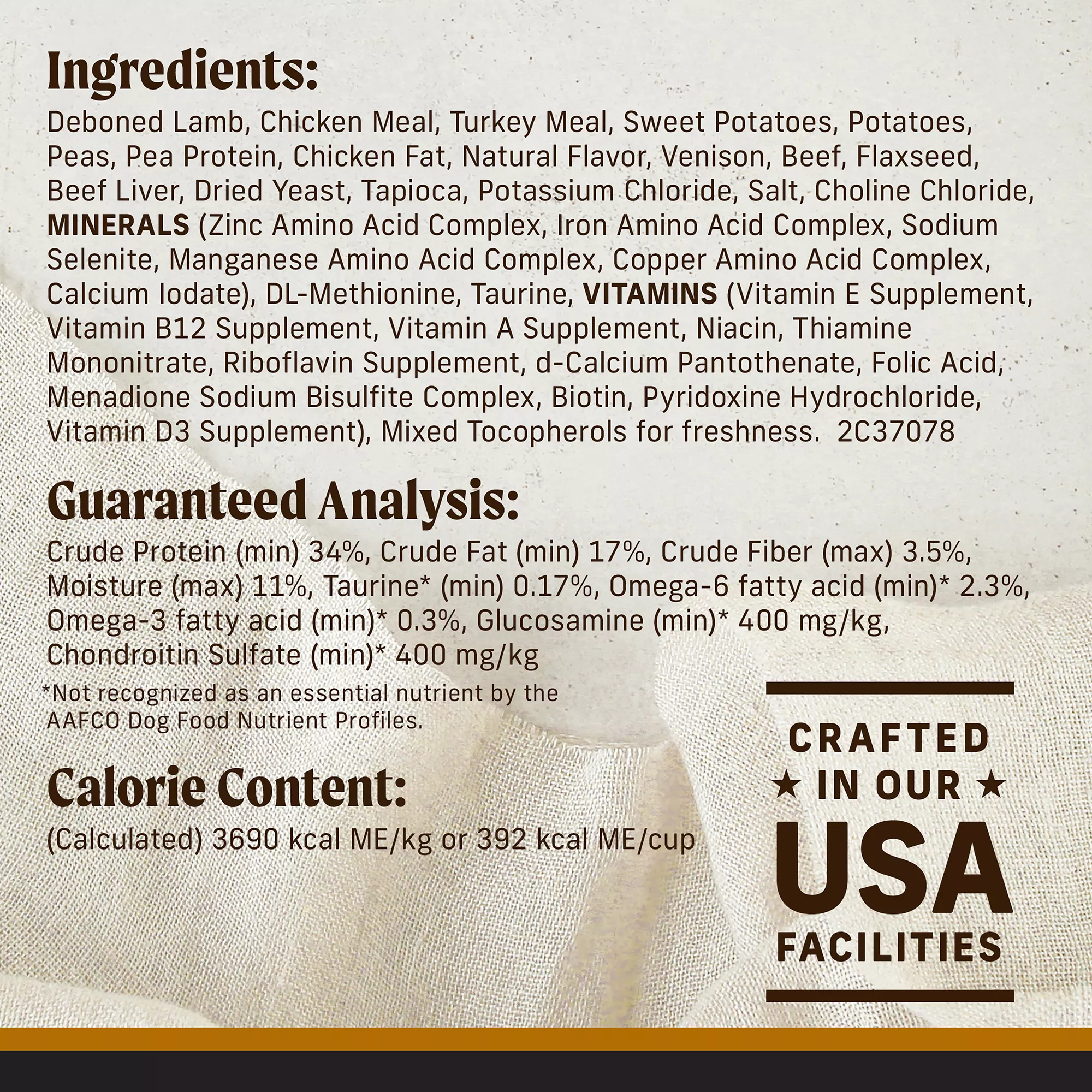 Ingredients: Deboned Lamb, Chicken Meal, Turkey Meal, Sweet Potatoes, Potatoes, Peas, Pea Protein, Chicken Fat, Natural Flavor, Venison, Beef, Flaxseed, Beef Liver, Dried Yeast, Tapioca, Potassium Chloride, Salt, Choline Chloride, Minerals (Zinc Amino Acid Complex, Iron Amino Acid Complex, Sodium Selenite, Manganese Amino Acid Complex, Copper Amino Acid Complex, Calcium Iodate), DL?Methionine, Taurine, Vitamins (Vitamin E Supplement, Vitamin B12 Supplement, Vitamin A Supplement, Niacin, Thiamine Mononitrate, Riboflavin Supplement, d?Calcium Pantothenate, Folic Acid, Menadione Sodium Bisulfite Complex, Biotin, Pyridoxine Hydrochloride, Vitamin D3 Supplement), Mixed Tocopherols For Freshness. 2C37078