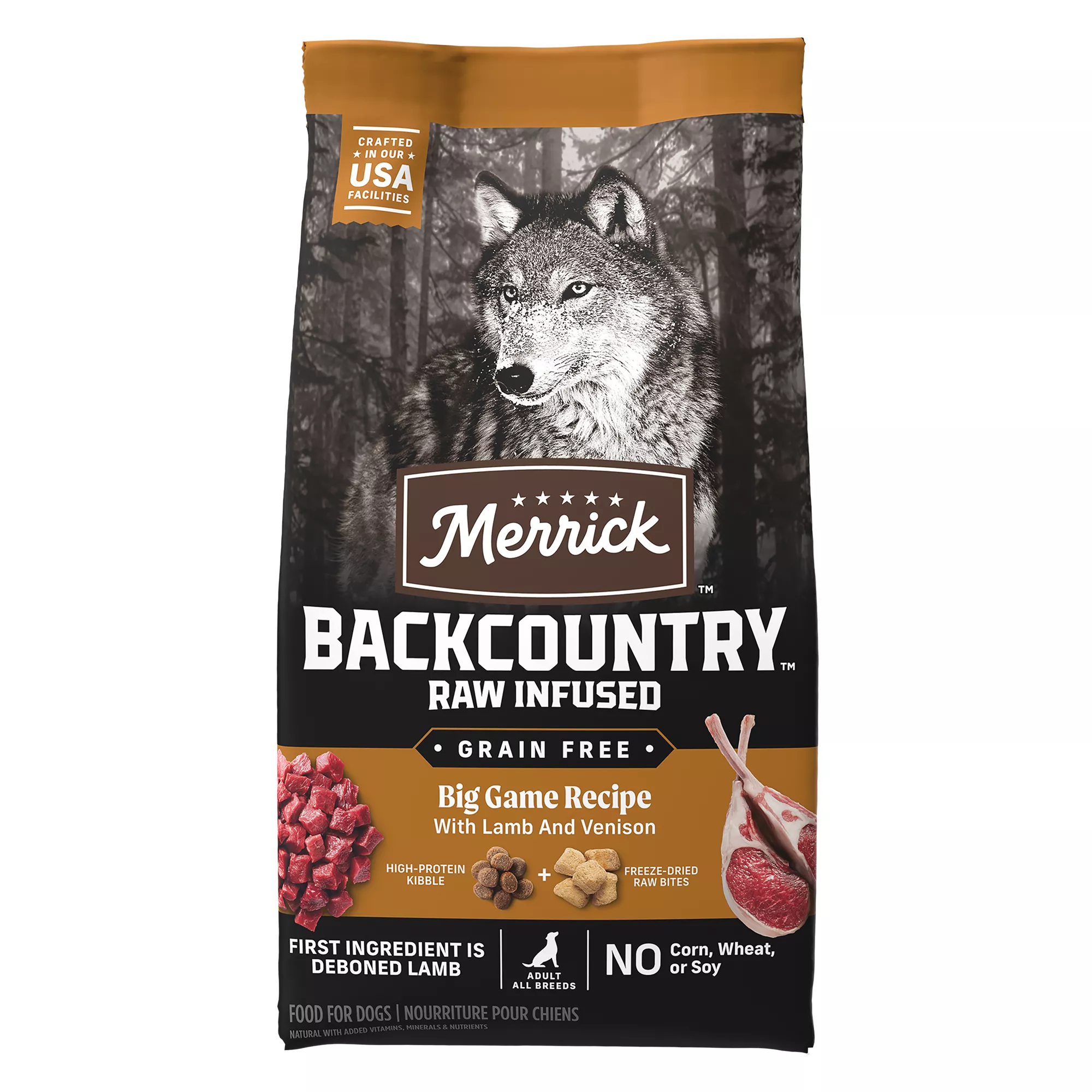 Features & Benefits: Merrick Backcountry Grain Free Big Game Recipe. Gluten Free Adult Dry Dog Food Kibble with Freeze Dried Raw Pieces. Real deboned lamb is the first ingredient in this high protein dog food formulated to maintain healthy muscles and energy levels, with added vitamins, minerals and nutrients. Wholesome grain free dry dog food recipe features a holistic blend of kibble and real freeze dried raw bites to deliver the nutritional benefits of an ancestral diet. Premium formula contains high levels of omega?6 and omega?3 fatty acids to nourish skin and coat, with glucosamine and chondroitin to support hips and joint. This premium real meat kibble with lamb and venison, is natural with added vitamins, minerals and nutrients, grain free, and gluten free. Proudly founded in Hereford, Texas, crafted in USA facilities.