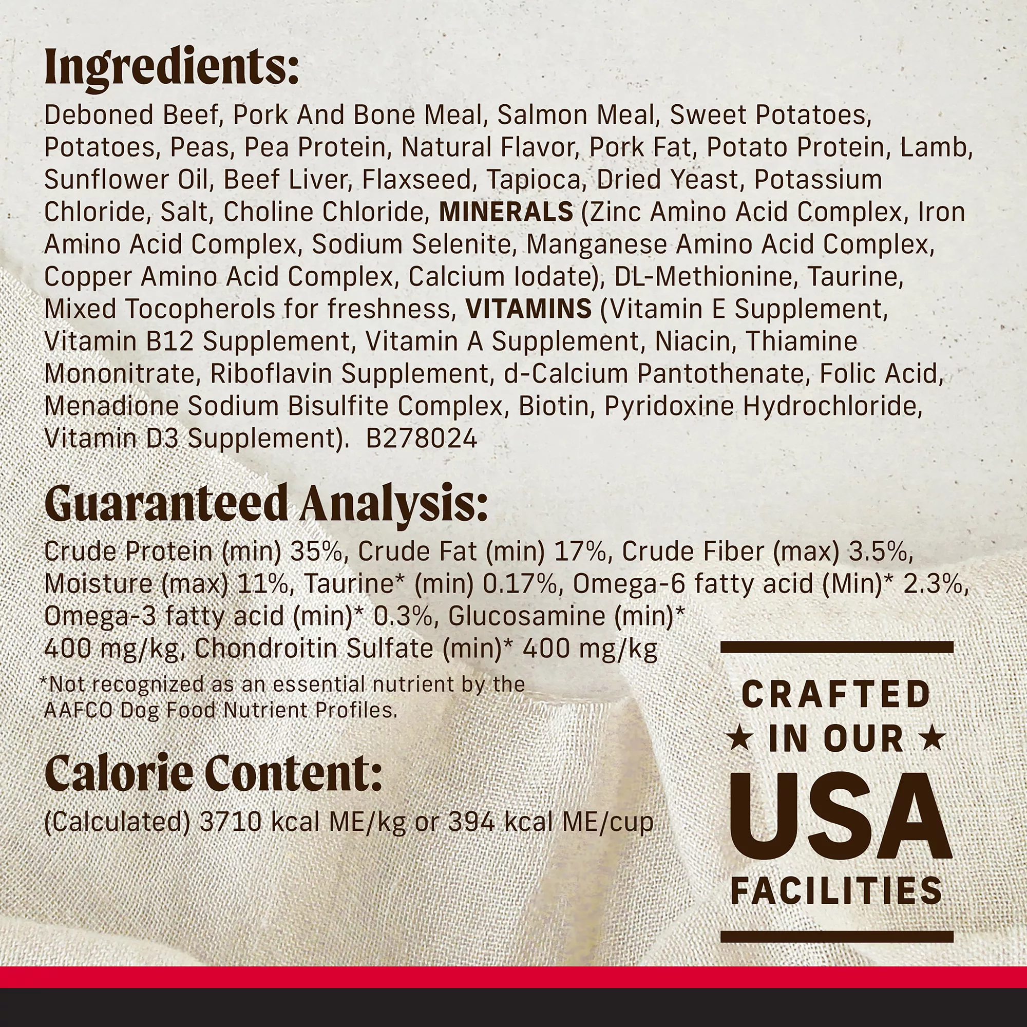 Ingredients: Deboned Beef, Pork and Bone Meal, Salmon Meal, Sweet Potatoes, Potatoes, Peas, Pea Protein, Natural Flavor, Pork Fat, Potato Protein, Lamb, Sunflower Oil, Beef Liver, Flaxseed, Tapioca, Dried Yeast, Potassium Chloride, Salt, Choline Chloride, MINERALS (Zinc Amino Acid Complex, Iron Amino Acid Complex, Sodium Selenite, Manganese Amino Acid Complex, Copper Amino Acid Complex, Calcium Iodate), DL?Methionine, Taurine, Mixed Tocopherols for freshness, VITAMINS (Vitamin E Supplement, Vitamin B12 Supplement, Vitamin A Supplement, Niacin, Thiamine Mononitrate, Riboflavin Supplement, D?Calcium Pantothenate, Folic Acid, Menadione Sodium Bisulfite Complex, Biotin, Pyridoxine Hydrochloride, Vitamin D3 Supplement) B278024