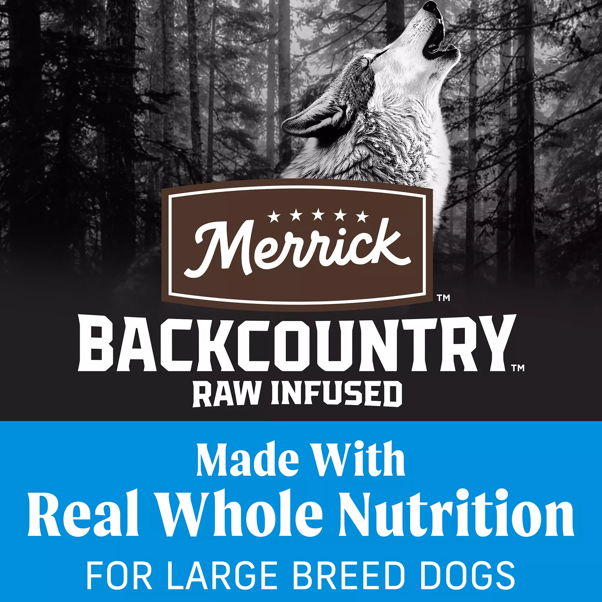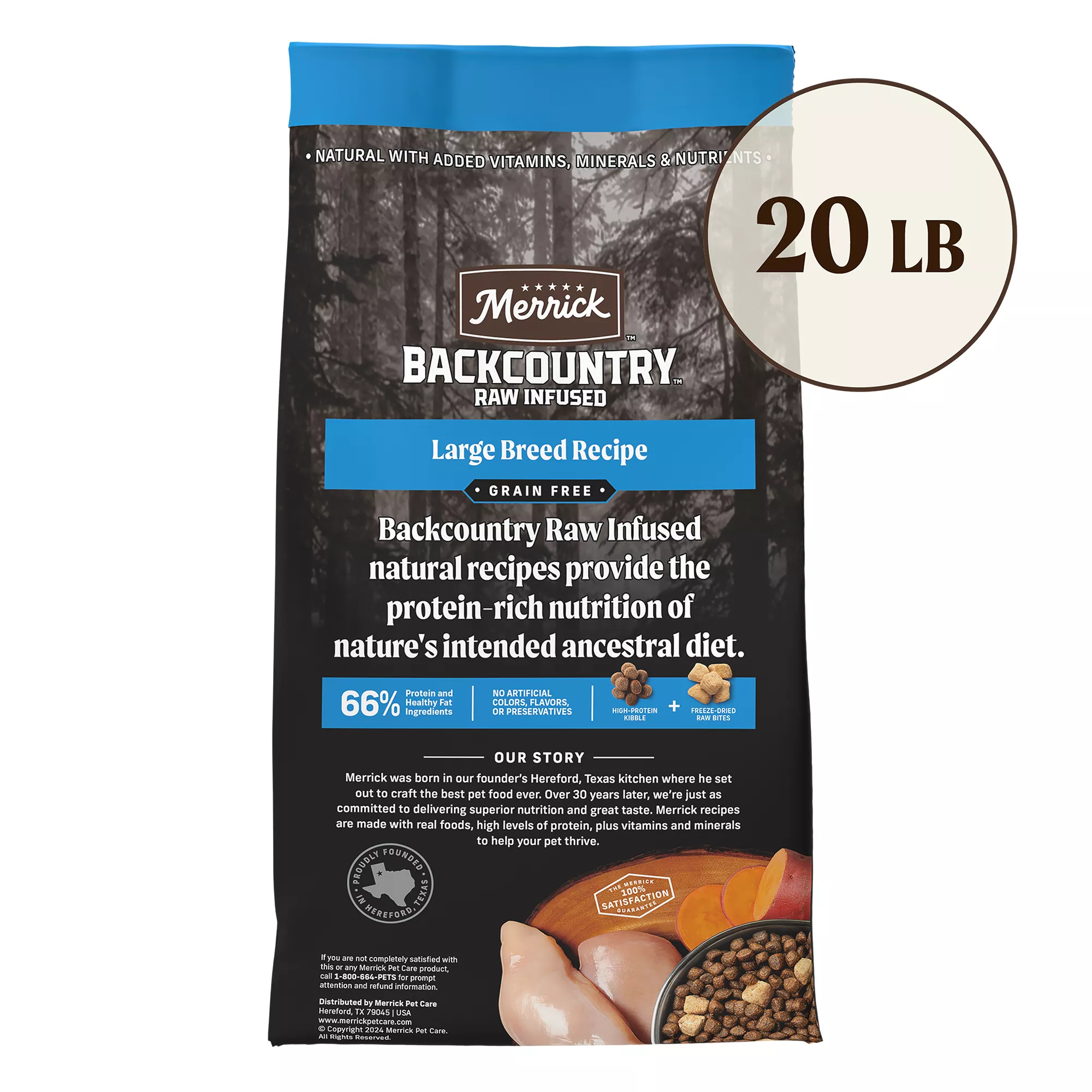 Features & Benefits: Merrick Backcountry Grain Free Large Breed Recipe. Gluten Free Adult Dry Dog Food Kibble with Freeze Dried Raw Pieces for Large Dogs. Real deboned chicken is the first ingredient in this high protein dog food formulated for big dogs to maintain healthy muscles and energy levels, with added vitamins, minerals and nutrients. Wholesome grain free dry dog food recipe features a holistic blend of kibble and real freeze dried raw bites to deliver the nutritional benefits of an ancestral diet. Premium formula contains high levels of omega?6 and omega?3 fatty acids to nourish skin and coat, with glucosamine and chondroitin to support hips and joint. This premium real meat kibble with chicken and lamb, is natural with added vitamins, minerals and nutrients, grain free and gluten free. Proudly founded in Hereford, Texas, crafted in USA facilities.