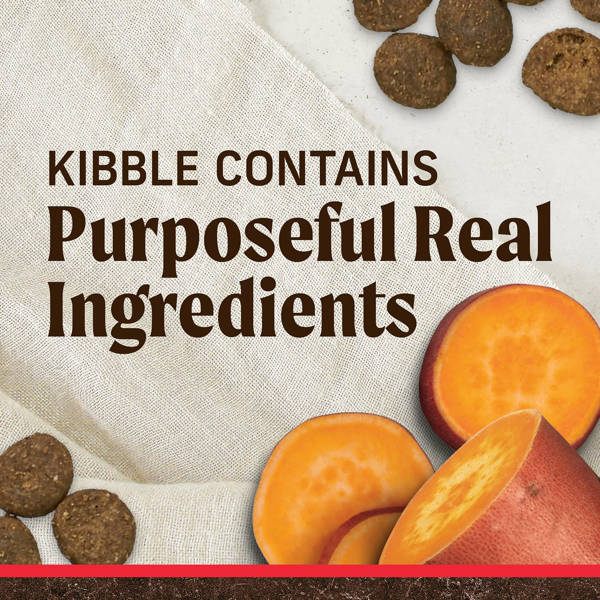 Dog food features a holistic blend of 62% protein and healthy fat ingredients to maintain lean muscle mass and energy levels, with 38% produce, fiber, vitamins, minerals, and other natural ingredients