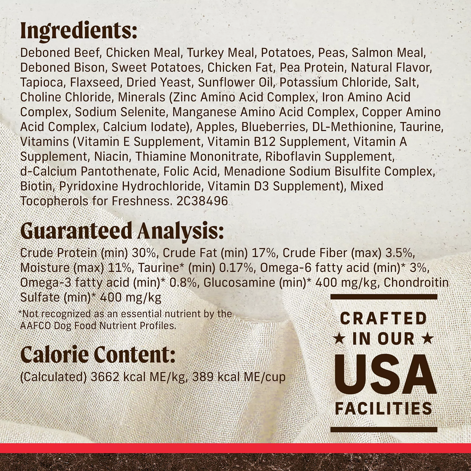 Ingredients: Deboned Beef, Chicken Meal, Turkey Meal, Potatoes, Peas, Salmon Meal, Deboned Bison, Sweet Potatoes, Chicken Fat, Pea Protein, Natural Flavor, Tapioca, Flaxseed, Dried Yeast, Sunflower Oil, Potassium Chloride, Salt, Choline Chloride, Minerals (Zinc Amino Acid Complex, Iron Amino Acid Complex, Sodium Selenite, Manganese Amino Acid Complex, Copper Amino Acid Complex, Calcium Iodate), Apples, Blueberries, DL?Methionine, Taurine, Vitamins (Vitamin E Supplement, Vitamin B12 Supplement, Vitamin A Supplement, Niacin, Thiamine Mononitrate, Riboflavin Supplement, d?Calcium Pantothenate, Folic Acid, Menadione Sodium Bisulfite Complex, Biotin, Pyridoxine Hydrochloride, Vitamin D3 Supplement), Mixed Tocopherols for Freshness. 2C38496