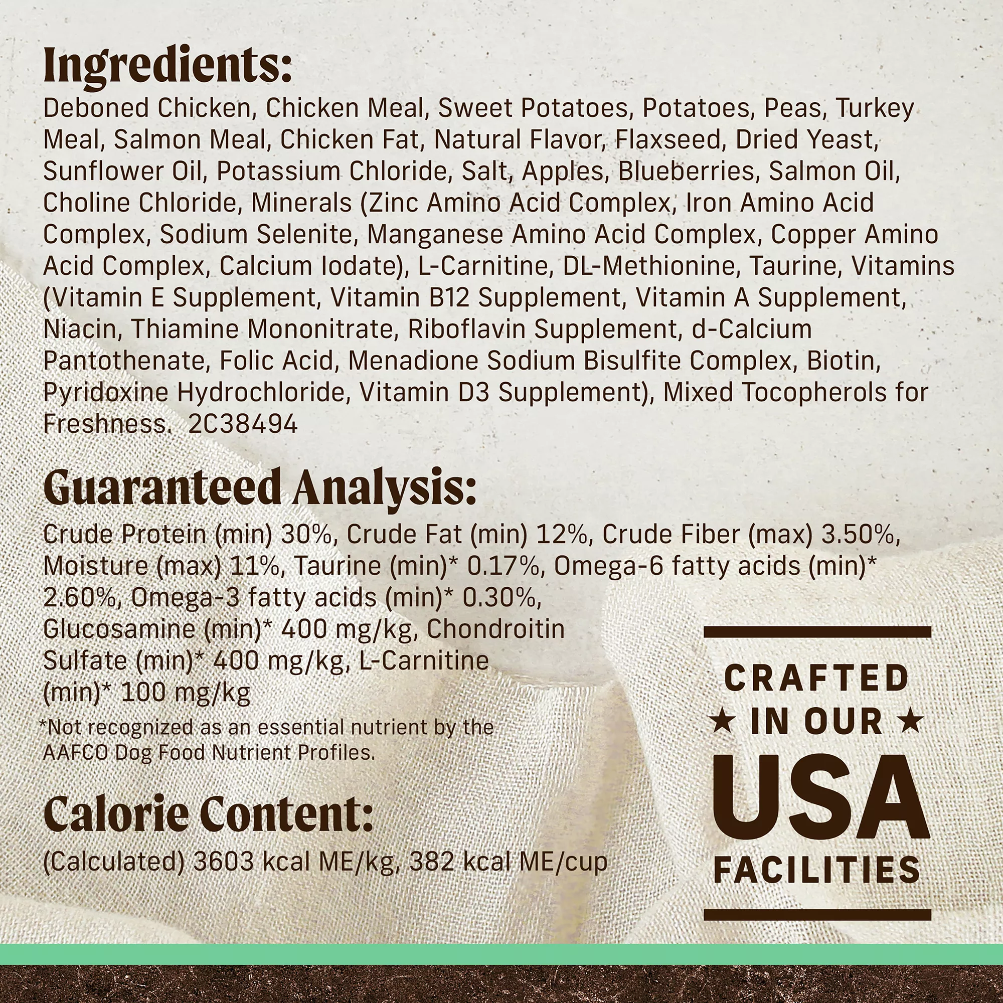 High protein dog food with omega fatty acids to support healthy skin and shiny coat, plus glucosamine and chondroitin for dogs to help maintain healthy hips and joints