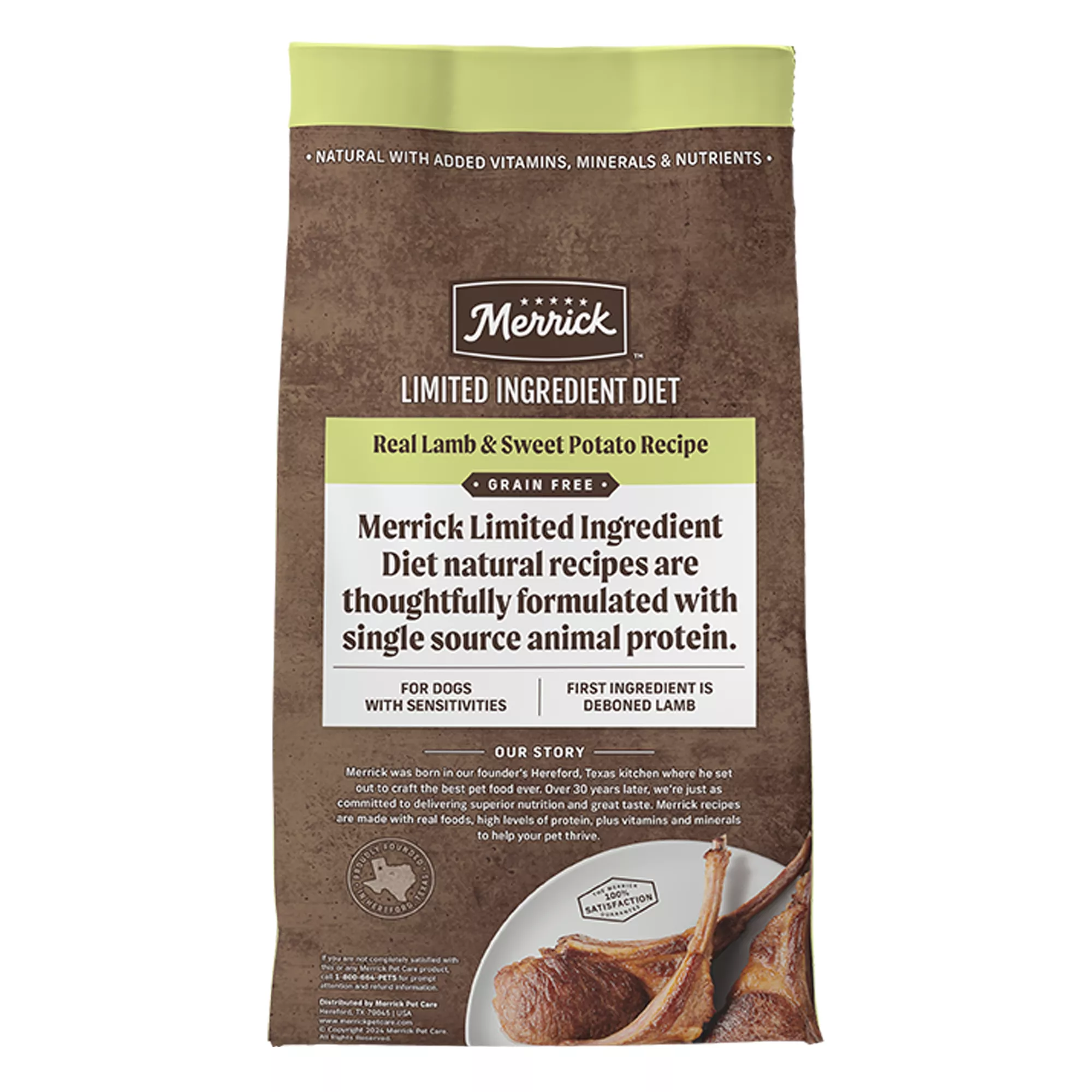 Serve your dog food they will love with Merrick Limited Ingredient Diet Grain Free Dry Dog Food, Real Lamb And Sweet Potato Recipe. Real deboned lamb is the first ingredient in this premium grain free dry dog food with single source animal protein. This holistic blend of kibble provides a high protein dog food option that helps support lean muscle mass and healthy energy levels. Crafted with purposeful real ingredients, this limited ingredient dog food is made specifically for dogs with sensitivities and contains no corn, wheat, soy, or artificial colors, flavors, or preservatives. Merrick lamb and sweet potato recipe dog food for adult dogs is natural with added vitamins, minerals, and nutrients and contains high levels of Omega fatty acids to help support your dog’s healthy skin and coat and high levels of glucosamine and chondroitin to support healthy hips and joints. Merrick dog food recipes are proudly founded in Hereford, Texas, crafted in USA facilities.