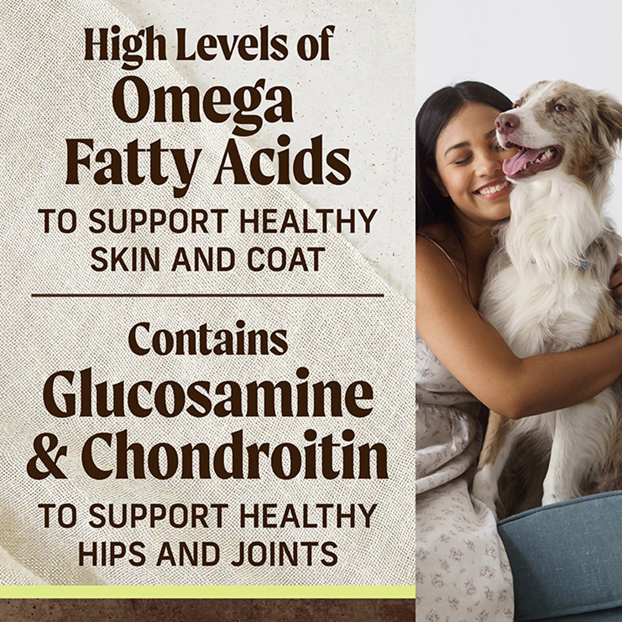 Gluten free holistic formula contains high levels of omega-6 and omega-3 fatty acids for a healthy skin and coat, and glucosamine and chondroitin for healthy hips and joints