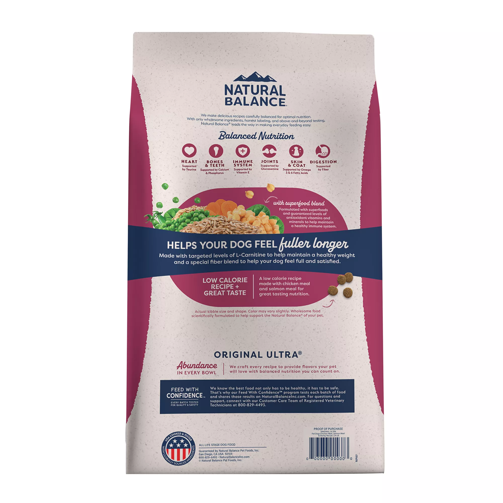 Natural Balance Original Ultra Fat Dogs Chicken Meal, Salmon Meal & Barley Recipe Dry Dog Food is a low calorie recipe made with chicken meal and salmon meal for great tasting nutrition. A special blend of fiber to help dogs feel fuller longer and support healthy digestion and targeted levels of L-Carnitine to help maintain a healthy weight. A special fiber blend helps dog’s feel full and satisfied. Formulated with superfoods and guaranteed levels of antioxidant vitamins and minerals to help maintain a healthy immune system. Made with wholesome grain.