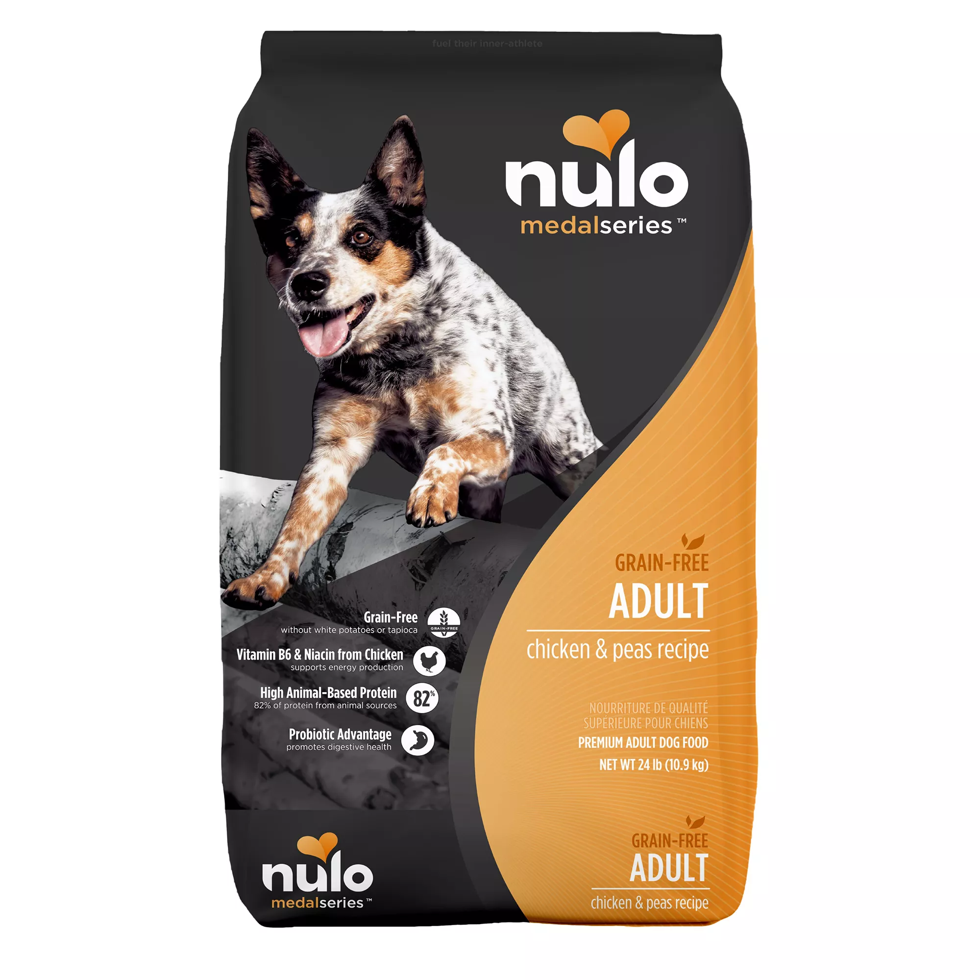 Delight your dog with this Nulo MedalSeries Grain-Free Adult Chicken & Peas Recipe Dog Food that is brimming with delicious chicken and peas and is specially formulated with low-glycemic-index ingredients, low carbs and a generous amount of meat. The food contains a probiotic that boosts healthy digestion and botanicals that help reduce toxins and promote healthy organs and tissues. Crafted free of grain, gluten, corn, wheat, soy, potatoes, meat by-products, GMOs and artificial flavors, colors and preservatives, the food offers a wholesome meal. Only at PetSmart.