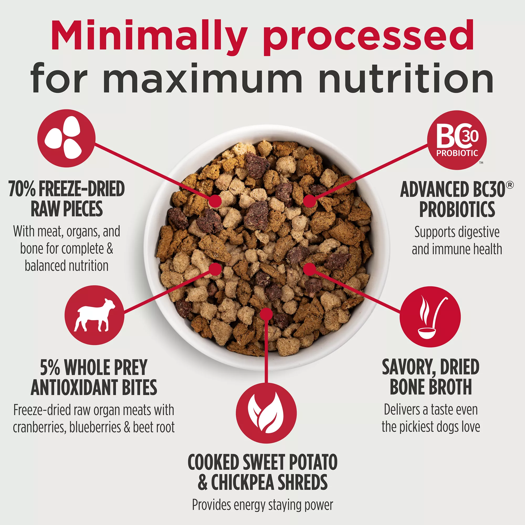 70% Freeze-Dried Raw Complete & Balanced Pieces: Freeze-dried raw meat, organs, & bone, functional ingredients, and the essential nutrients your dog needs to thrive.