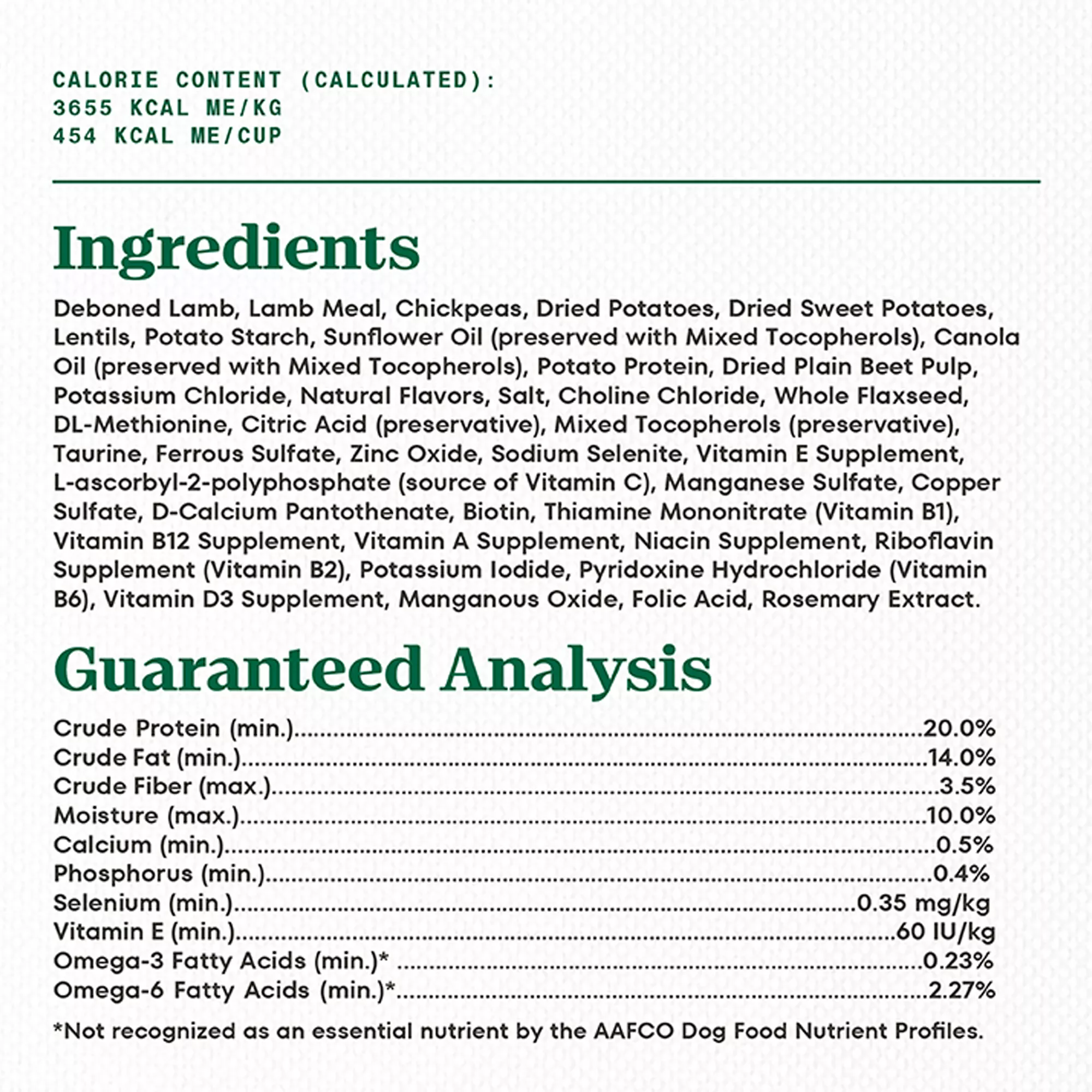 Ingredients: Deboned Lamb, Lamb Meal, Chickpeas, Dried Potatoes, Dried Sweet Potatoes, Lentils, Potato Starch, Sunflower Oil (preserved with Mixed Tocopherols), Canola Oil (preserved with Mixed Tocopherols), Potato Protein, Dried Plain Beet Pulp, Potassium Chloride, Natural Flavors, Salt, Choline Chloride, Whole Flaxseed, DL?Methionine, Citric Acid (preservative), Mixed Tocopherols (preservative), Taurine, Ferrous Sulfate, Zinc Oxide, Sodium Selenite, Vitamin E Supplement, L?ascorbyl?2?polyphosphate (source of Vitamin C), Manganese Sulfate, Copper Sulfate, D?Calcium Pantothenate, Biotin, Thiamine Mononitrate (Vitamin B1), Vitamin B12 Supplement, Vitamin A Supplement, Niacin Supplement, Riboflavin Supplement (Vitamin B2), Potassium Iodide, Pyridoxine Hydrochloride (Vitamin B6), Vitamin D3 Supplement, Manganous Oxide, Folic Acid, Rosemary Extract.