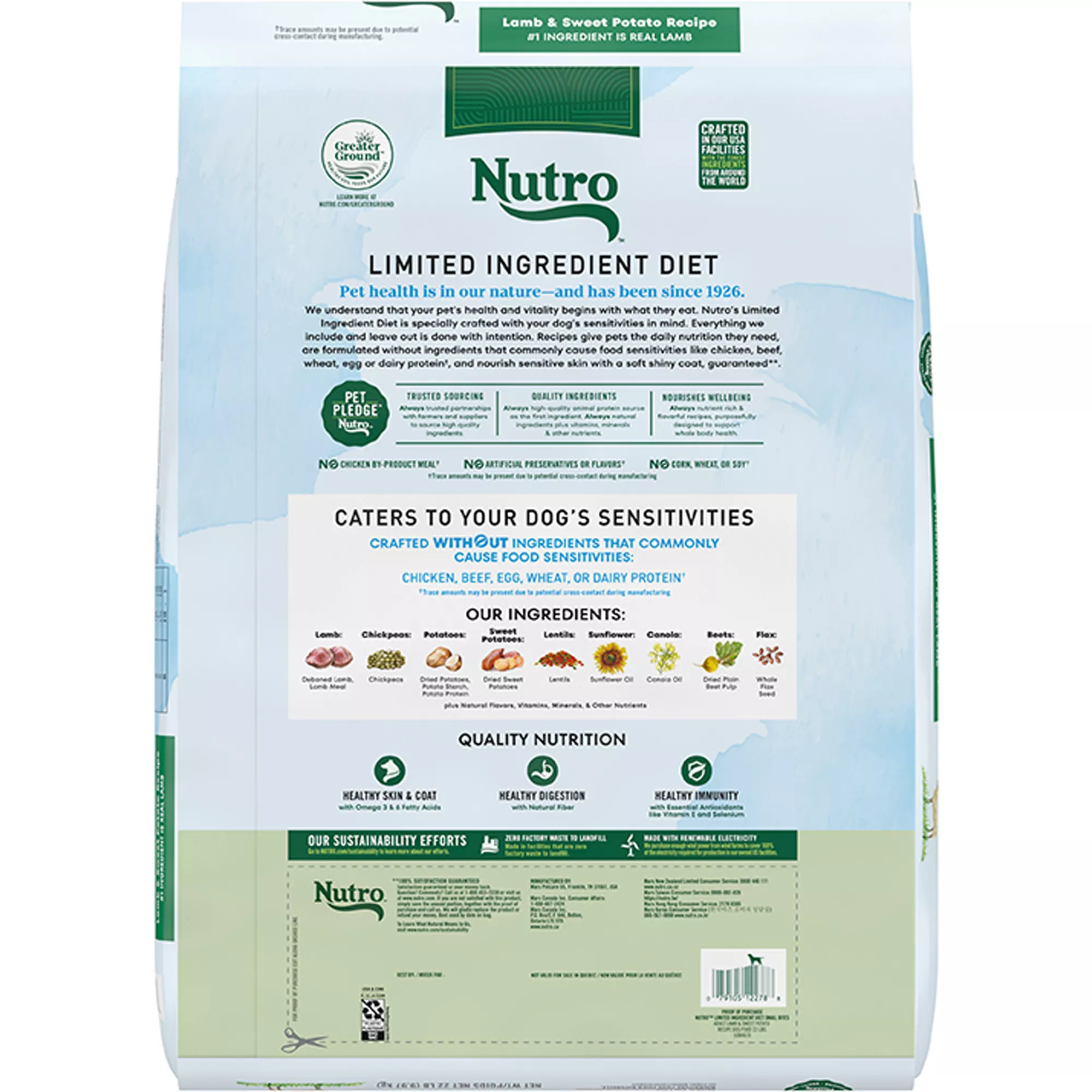 Description: The Nutro Limited Ingredient Diet is specially crafted with your dog’s sensitivities in mind. Everything we include and leave out is done with intention. Nutro Limited Ingredient Diet Small Bites Adult Dry Dog Food, Lamb & Sweet Potato Recipe is always made with 10 key ingredients or less. You can feel confident you’re giving your dog a quality recipe that’s made with non?GMO ingredients and has no chicken by?product meal, corn, wheat, or soy. This dry dog food recipe is made with lamb as the #1 ingredient and is designed with Omega 3 & 6 Fatty Acids to promote healthy skin and a soft, shiny coat. Formulated for dogs that prefer smaller kibble, this dry dog food recipe contains natural fiber to promote healthy digestion and has essential antioxidants like Vitamin E and Selenium to support your dog’s immunity. Nutro understands your pet’s health and vitality begins with what they eat; that’s why they serve quality recipes, tasty flavors, and wholesome ingredients.