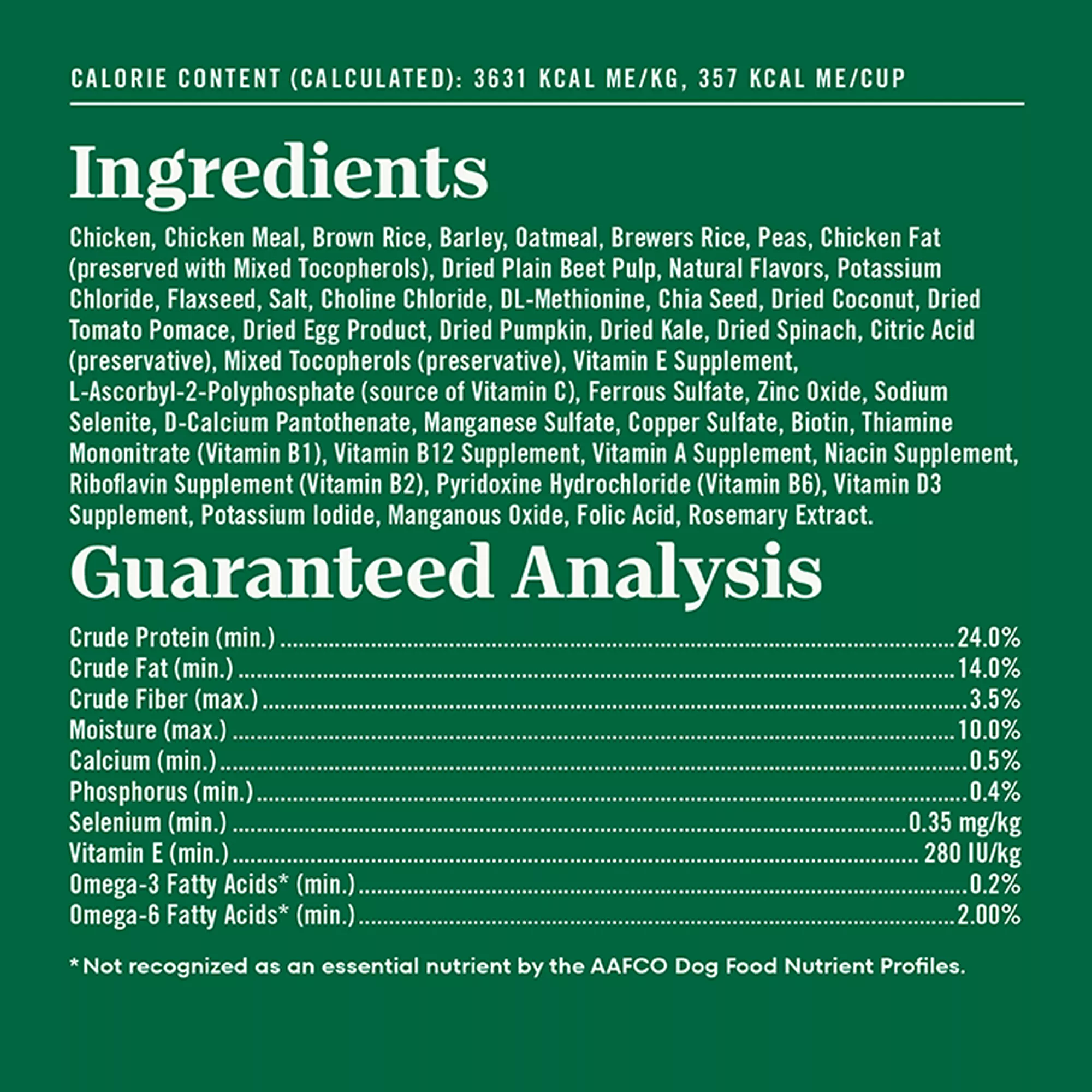 Ingredients: Chicken, Chicken Meal, Brown Rice, Barley, Oatmeal, Brewers Rice, Peas, Chicken Fat (preserved with Mixed Tocopherols), Dried Plain Beet Pulp, Natural Flavors, Potassium Chloride, Flaxseed, Salt, Choline Chloride, DL?Methionine, Chia Seed, Dried Coconut, Dried Tomato Pomace, Dried Egg Product, Dried Pumpkin, Dried Kale, Dried Spinach, Citric Acid (preservative), Mixed Tocopherols (preservative), Vitamin E Supplement, L?Ascorbyl?2?Polyphosphate (source of Vitamin C), Ferrous Sulfate, Zinc Oxide, Sodium Selenite, D?Calcium Pantothenate, Manganese Sulfate, Copper Sulfate, Biotin, Thiamine Mononitrate (Vitamin B1), Vitamin B12 Supplement, Vitamin A Supplement, Niacin Supplement, Riboflavin Supplement (Vitamin B2), Pyridoxine Hydrochloride (Vitamin B6), Vitamin D3 Supplement, Potassium Iodide, Manganous Oxide, Folic Acid, Rosemary Extract.