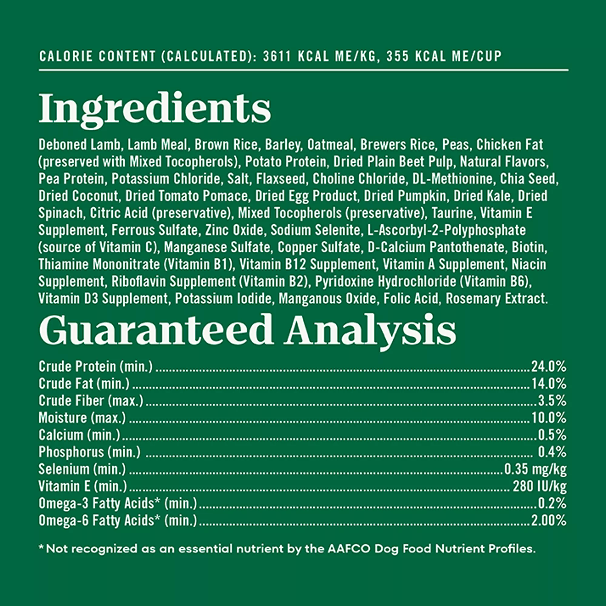 Ingredients: Deboned Lamb, Lamb Meal, Brown Rice, Barley, Oatmeal, Brewers Rice, Peas, Chicken Fat (preserved with Mixed Tocopherols), Potato Protein, Dried Plain Beet Pulp, Natural Flavors, Pea Protein, Potassium Chloride, Salt, Flaxseed, Choline Chloride, DL?Methionine, Chia Seed, Dried Coconut, Dried Tomato Pomace, Dried Egg Product, Dried Pumpkin, Dried Kale, Dried Spinach, Citric Acid (preservative), Mixed Tocopherols (preservative), Taurine, Vitamin E Supplement, Ferrous Sulfate, Zinc Oxide, Sodium Selenite, L?Ascorbyl?2?Polyphosphate (source of Vitamin C), Manganese Sulfate, Copper Sulfate, D?Calcium Pantothenate, Biotin, Thiamine Mononitrate (Vitamin B1), Vitamin B12 Supplement, Vitamin A Supplement, Niacin Supplement, Riboflavin Supplement (Vitamin B2), Pyridoxine Hydrochloride (Vitamin B6), Vitamin D3 Supplement, Potassium Iodide, Manganous Oxide, Folic Acid, Rosemary Extract.