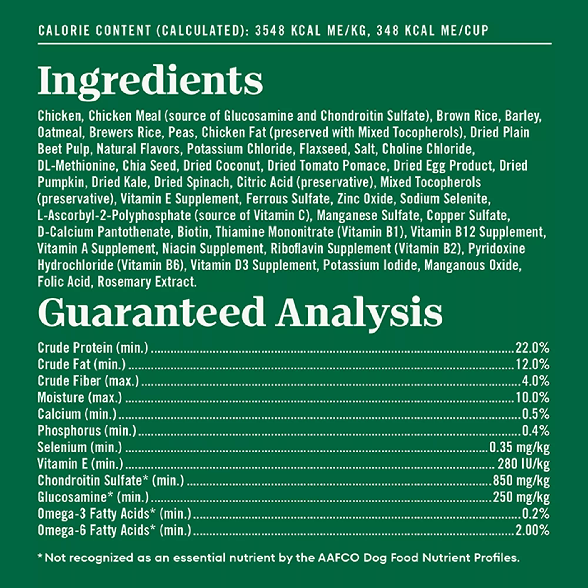 Ingredients: Chicken, Chicken Meal (source of Glucosamine and Chondroitin Sulfate), Brown Rice, Barley, Oatmeal, Brewers Rice, Peas, Chicken Fat (preserved with Mixed Tocopherols), Dried Plain Beet Pulp, Natural Flavors, Potassium Chloride, Flaxseed, Salt, Choline Chloride, DL?Methionine, Chia Seed, Dried Coconut, Dried Tomato Pomace, Dried Egg Product, Dried Pumpkin, Dried Kale, Dried Spinach, Citric Acid (preservative), Mixed Tocopherols (preservative), Vitamin E Supplement, Ferrous Sulfate, Zinc Oxide, Sodium Selenite, L?Ascorbyl?2?Polyphosphate (source of Vitamin C), Manganese Sulfate, Copper Sulfate, D?Calcium Pantothenate, Biotin, Thiamine Mononitrate (Vitamin B1), Vitamin B12 Supplement, Vitamin A Supplement, Niacin Supplement, Riboflavin Supplement (Vitamin B2), Pyridoxine Hydrochloride (Vitamin B6), Vitamin D3 Supplement, Potassium Iodide, Manganous Oxide, Folic Acid, Rosemary Extract.