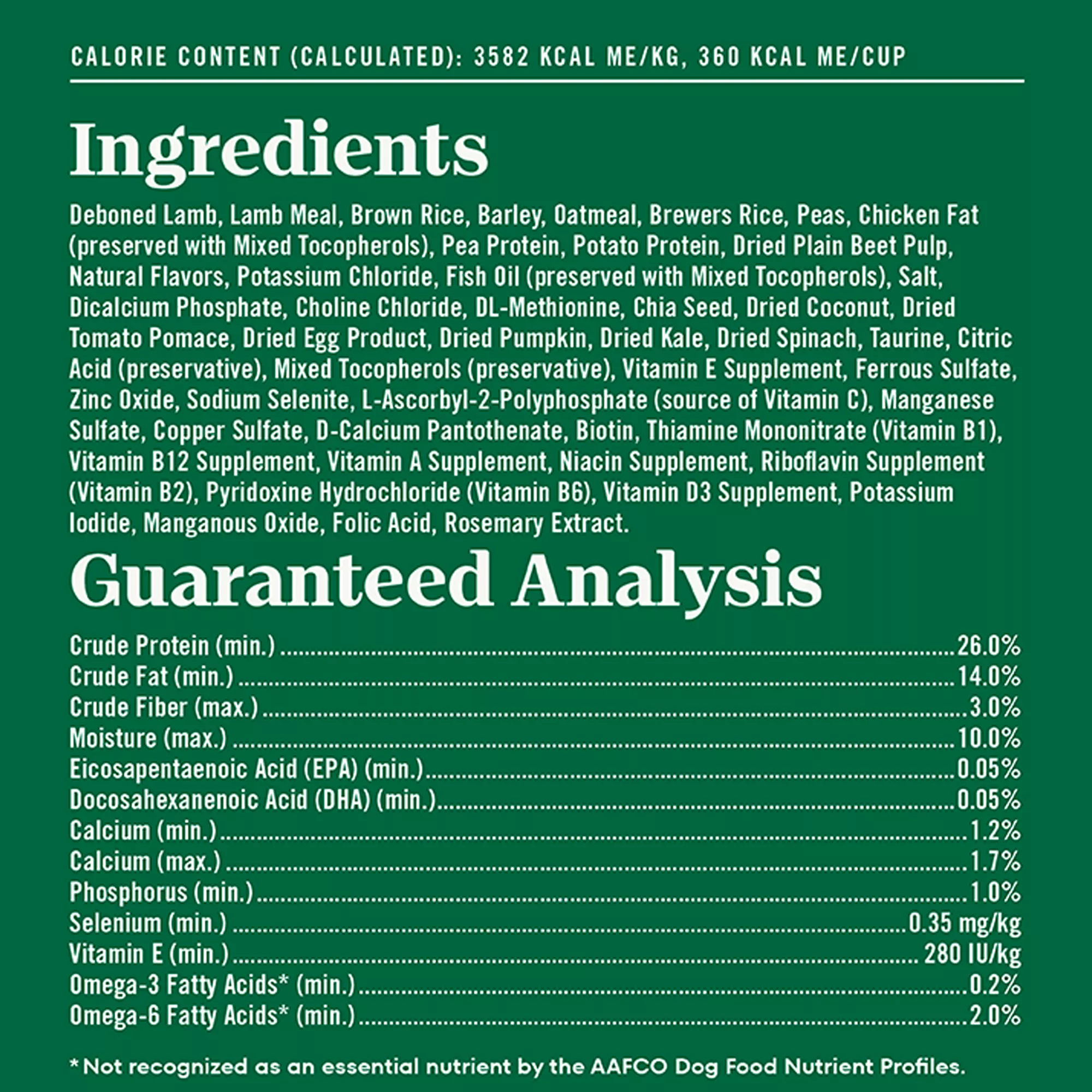 Ingredients: Deboned Lamb, Lamb Meal, Brown Rice, Barley, Oatmeal, Brewers Rice, Peas, Chicken Fat (preserved with Mixed Tocopherols), Pea Protein, Potato Protein, Dried Plain Beet Pulp, Natural Flavors, Potassium Chloride, Fish Oil (preserved with Mixed Tocopherols), Salt, Dicalcium Phosphate, Choline Chloride, DL?Methionine, Chia Seed, Dried Coconut, Dried Tomato Pomace, Dried Egg Product, Dried Pumpkin, Dried Kale, Dried Spinach, Taurine, Citric Acid (preservative), Mixed Tocopherols (preservative), Vitamin E Supplement, Ferrous Sulfate, Zinc Oxide, Sodium Selenite, L?Ascorbyl?2?Polyphosphate (source of Vitamin C), Manganese Sulfate, Copper Sulfate, D?CalciumPantothenate, Biotin, Thiamine Mononitrate (Vitamin B1), Vitamin B12 Supplement, Vitamin A Supplement, Niacin Supplement, Riboflavin Supplement (Vitamin B2), Pyridoxine Hydrochloride (Vitamin B6), Vitamin D3 Supplement, Potassium Iodide, Manganous Oxide, Folic Acid, Rosemary Extract.