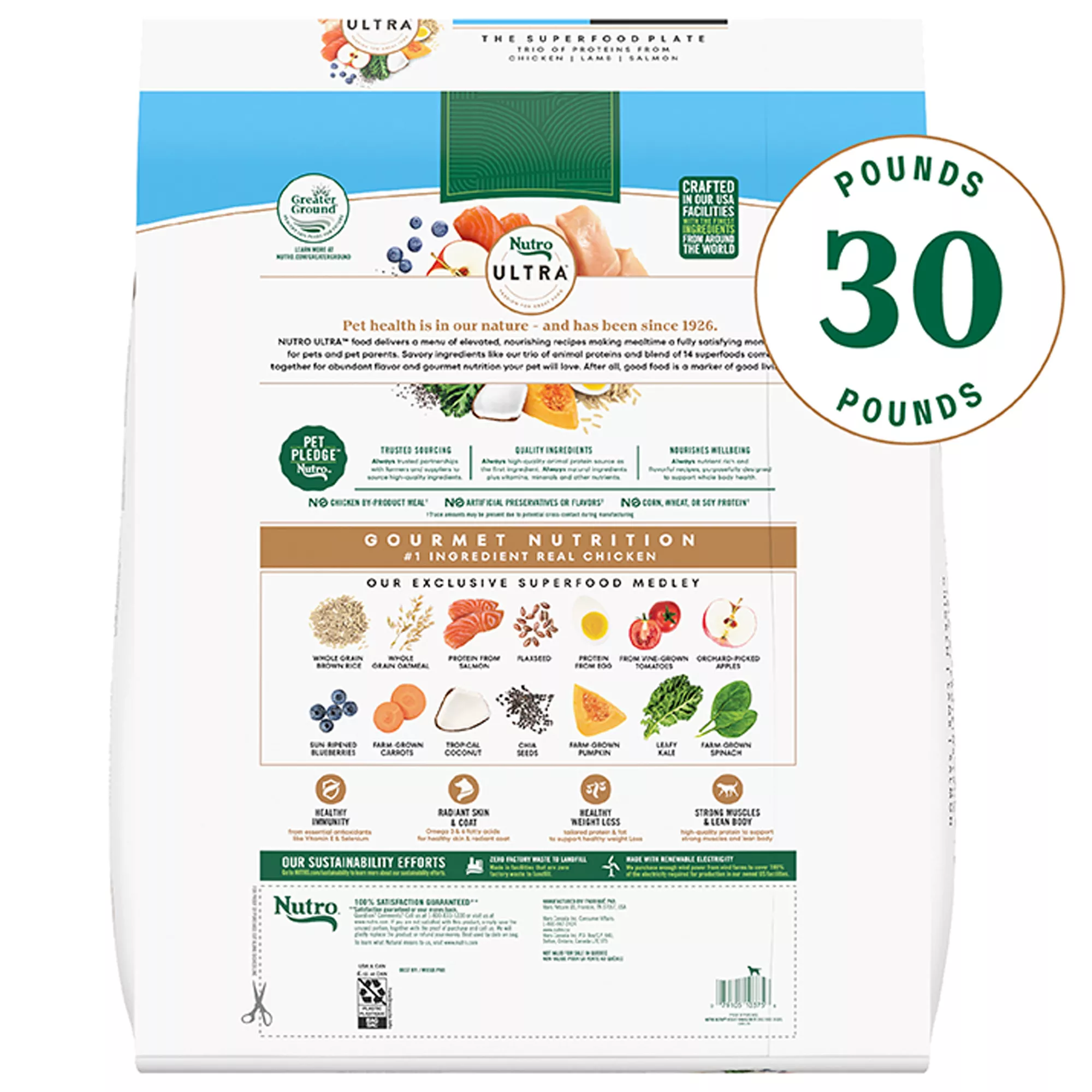 Contains one (1) 30 lb. Bag of Nutro Ultra Adult Weight Management High Protein Dry Dog Food with a Trio of Proteins from Chicken, Lamb and Salmon.