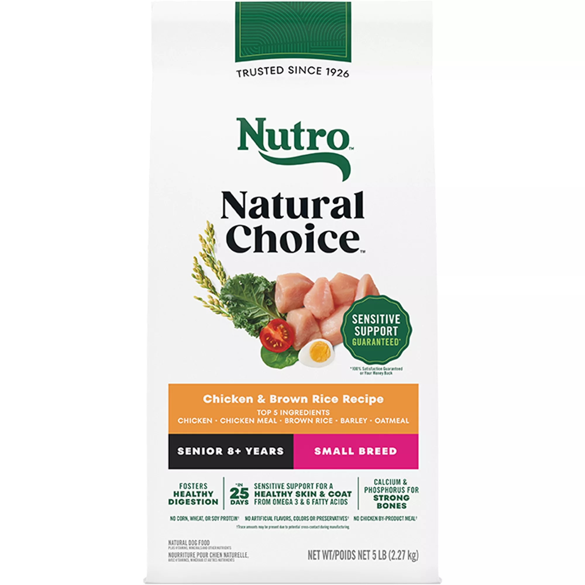 Contains: Contains one (1) 5 lb. bag of Nutro Natural Choice Senior Dog Food, Chicken & Brown Rice Recipe.