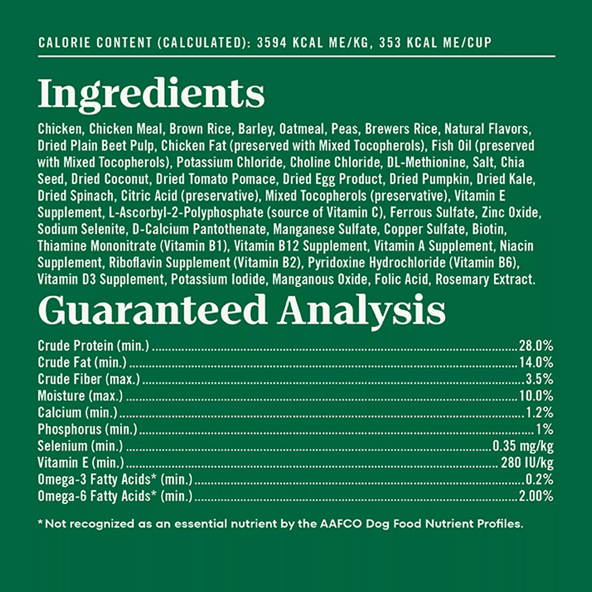Ingredients: Chicken, Chicken Meal, Brown Rice, Barley, Oatmeal, Peas, Brewers Rice, Natural Flavors, Dried Plain Beet Pulp, Chicken Fat (preserved with Mixed Tocopherols), Fish Oil (preserved with Mixed Tocopherols), Potassium Chloride, Choline Chloride, DL?Methionine, Salt, Chia Seed, Dried Coconut, Dried Tomato Pomace, Dried Egg Product, Dried Pumpkin, Dried Kale, Dried Spinach, Citric Acid (preservative), Mixed Tocopherols (preservative), Vitamin E Supplement, L?Ascorbyl?2?Polyphosphate (source of Vitamin C), Ferrous Sulfate, Zinc Oxide, Sodium Selenite, D?Calcium Pantothenate, Manganese Sulfate, Copper Sulfate, Biotin, Thiamine Mononitrate (Vitamin B1), Vitamin B12 Supplement, Vitamin A Supplement, Niacin Supplement, Riboflavin Supplement (Vitamin B2), Pyridoxine Hydrochloride (Vitamin B6), Vitamin D3 Supplement, Potassium Iodide, Manganous Oxide, Folic Acid, Rosemary Extract.