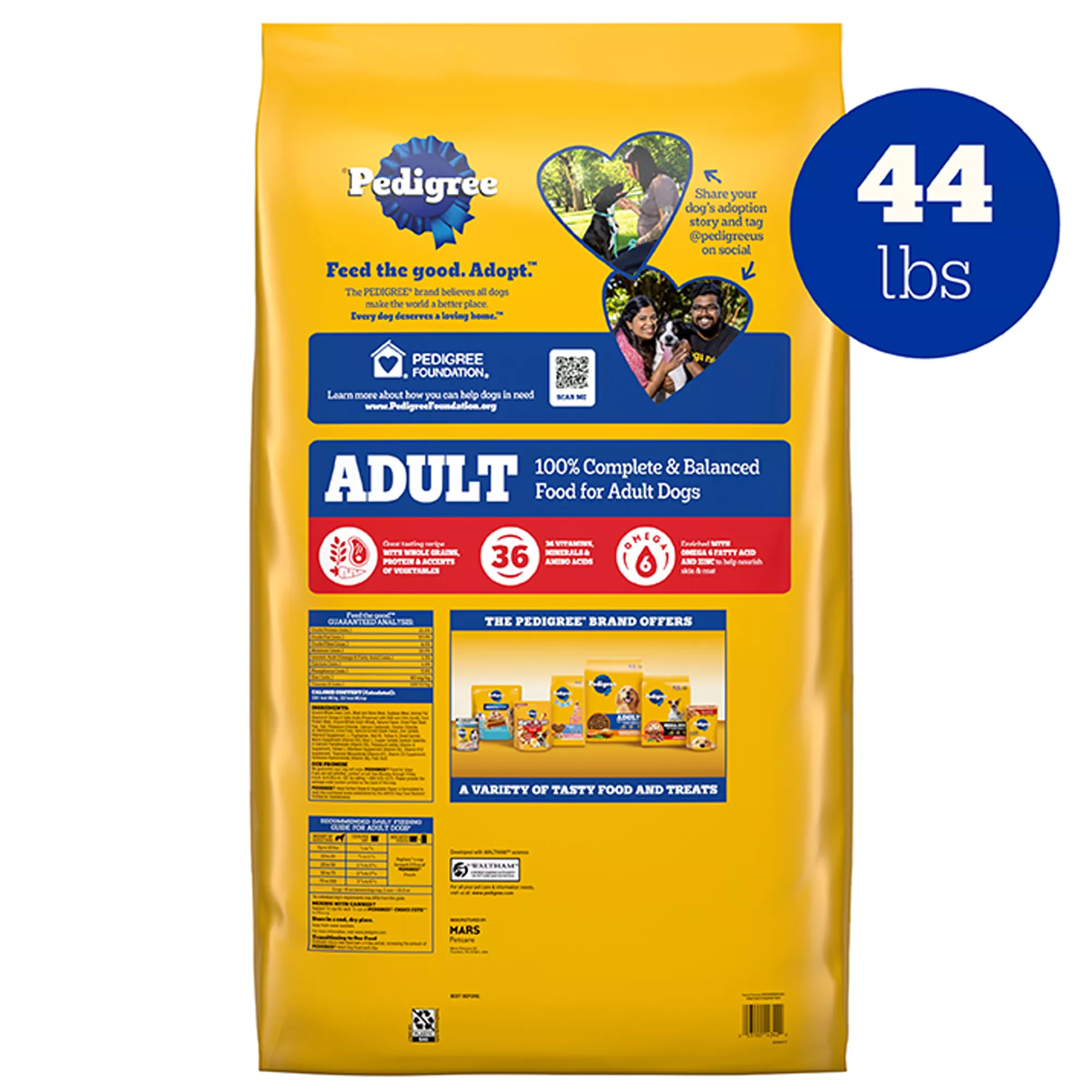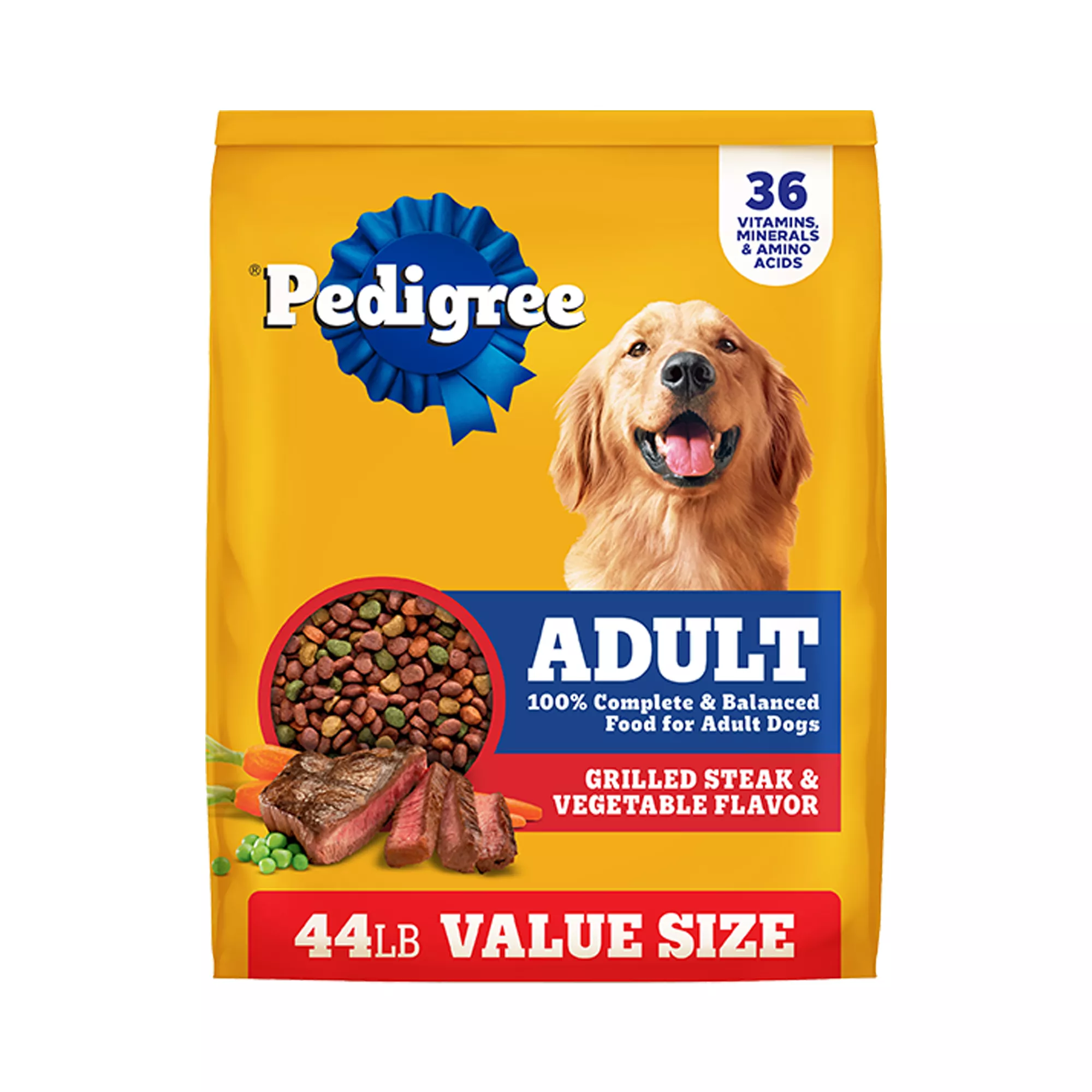 Contains one (1) 44 lb. Bag of Pedigree Adult Dry Dog Food, Grilled Steak and Vegetable Flavor.