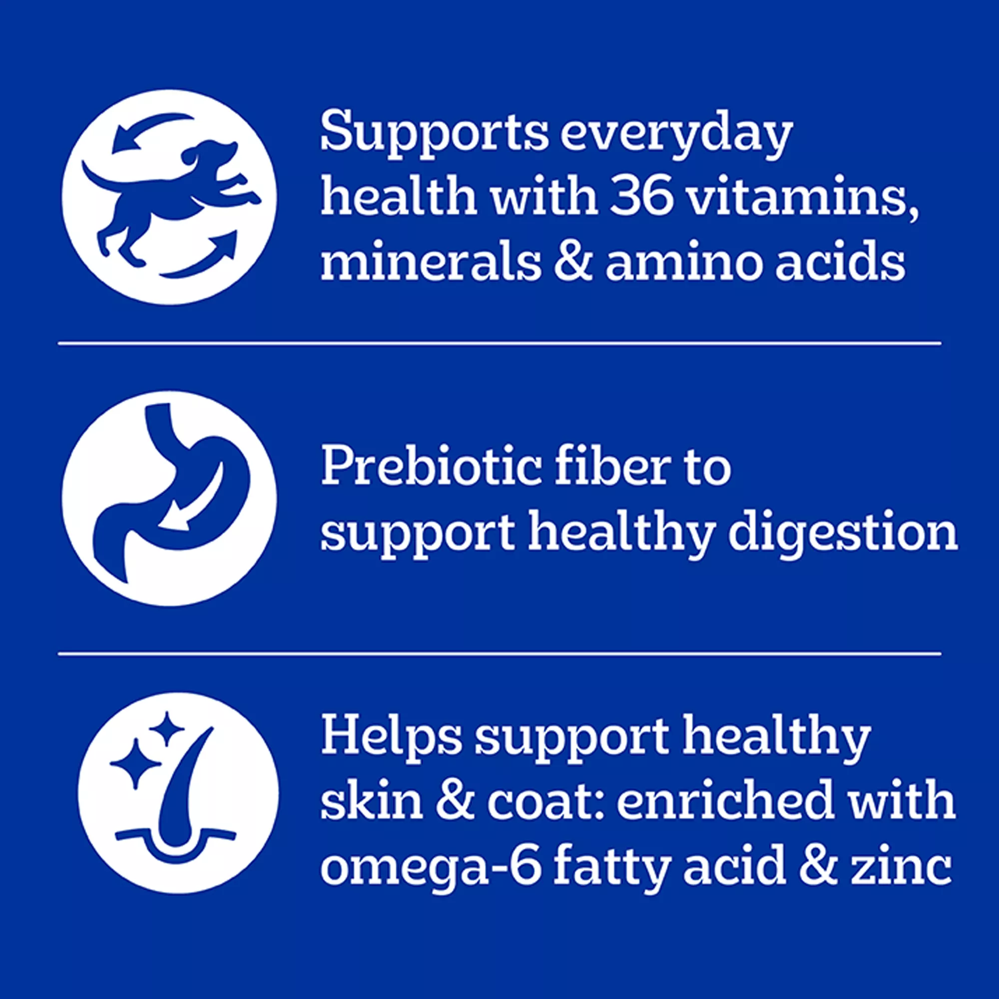 Supports Healthy Skin and Coat: This dry dog food recipe is enriched with Omega 6 Fatty Acid and Zinc to help nourish a healthy skin and coat.