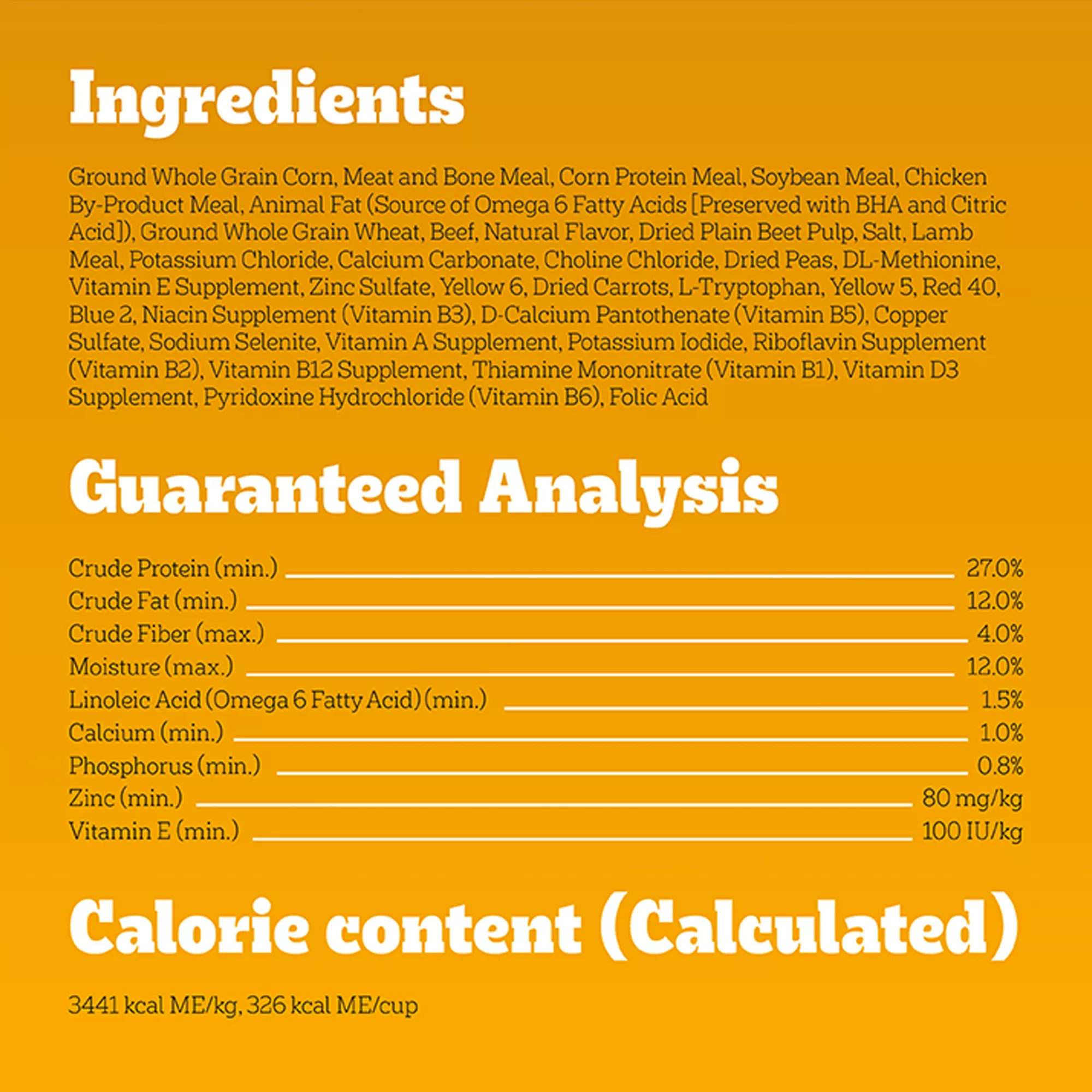 Ingredients: Ground Whole Grain Corn, Meat and Bone Meal, Corn Protein Meal, Soybean Meal, Chicken By?Product Meal, Animal Fat (Source of Omega 6 Fatty Acids [Preserved with BHA and Citric Acid]), Ground Whole Grain Wheat, Beef, Natural Flavor, Dried Plain Beet Pulp, Salt, BHA (Preservative), Citric Acid (Preservative), Lamb Meal, Choline Chloride, Potassium Chloride, Dried Peas, Calcium Carbonate, DL?Methionine, Zinc Sulfate, Vitamin E Supplement, Dried Carrots, L?Tryptophan, Yellow 6, Red 40, Niacin Supplement (Vitamin B3), Blue 2, D?Calcium Pantothenate (Vitamin B5), Copper Sulfate, Yellow 5, Sodium Selenite, Potassium Iodide, Vitamin A Supplement, Riboflavin Supplement (Vitamin B2), Vitamin B12 Supplement, Thiamine Mononitrate (Vitamin B1), Vitamin D3 Supplement, Pyridoxine Hydrochloride (Vitamin B6), Folic Acid.