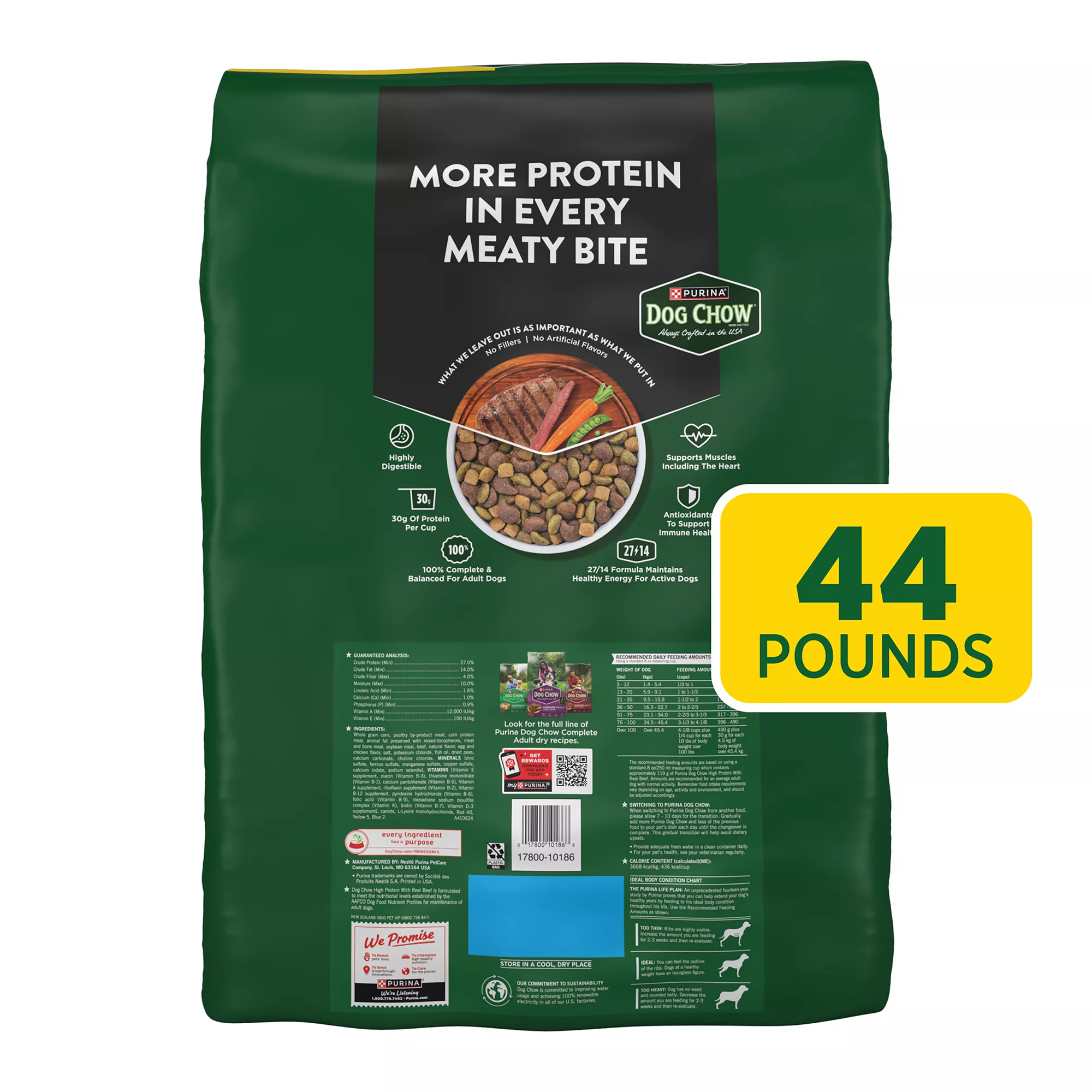 Key Benefits: Dry dog food with 25 percent more protein than Purina Dog Chow Complete to help support healthy muscles and a healthy active life overall, Adult dog food delivering 100 percent complete and balanced nutrition for adult dogs, containing 23 vitamins and minerals, Mouthwatering high-protein dog food made with real beef and no artificial flavors, Purina Dog Chow dog food that’s always crafted in the USA and backed by nearly 100 years of dog expertise, Crunchy Purina dog food kibble helps clean dogs’ teeth, Spoil your pet with Purina products. Reward yourself with points on every purchase. Download the myPurina app today.