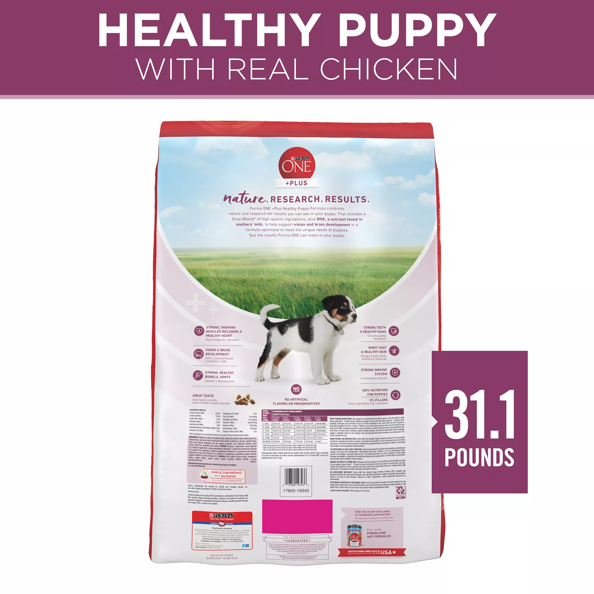 this stage in life. Every serving of our Purina ONE +Plus Healthy Puppy formula contains DHA, a nutrient also found in mother’s milk, to support his vision and brain development, and a blend of four antioxidant sources helps promote a strong immune system. This healthy puppy food formula is highly digestible, and natural sources of glucosamine help support healthy joints. Plus, crunchy kibble and calcium support his strong teeth and healthy gums. We use no artificial flavors or preservatives in this natural dry puppy food recipe, which contains 100% nutrition and 0% fillers, meaning every ingredient has a purpose. Give your playful puppy the complete and balanced nutrition he needs to support his lifelong whole-body health when you fill his bowl with this delicious puppy food for all breeds from Purina ONE, a veterinarian-recommended brand.