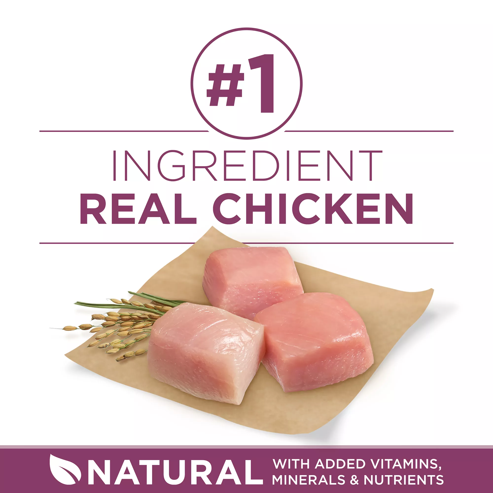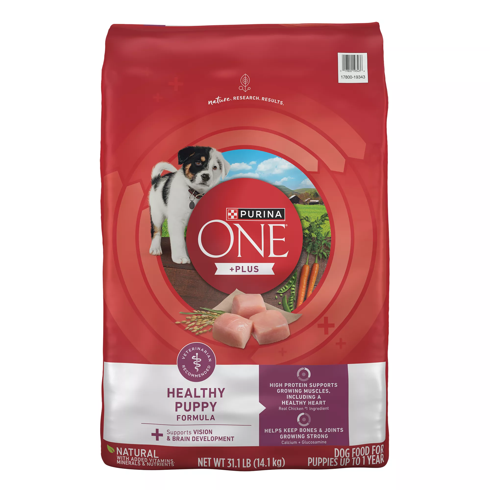 Tend to the unique nutritional needs of your new puppy by serving him Purina ONE +Plus Natural Healthy Puppy Formula dry puppy food with added vitamins, minerals and nutrients. Real chicken is the first ingredient in our natural puppy food, helping to provide the high protein he requires for strong, growing muscles, including a healthy heart. We include rice and oatmeal in this high protein puppy food that gives your growing puppy the nutrition he needs at