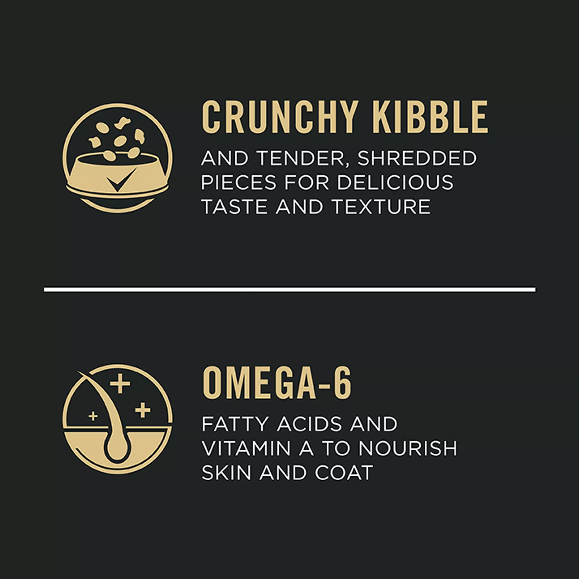 Crunchy dog kibble combined with tender, shredded pieces for taste and texture dogs love.