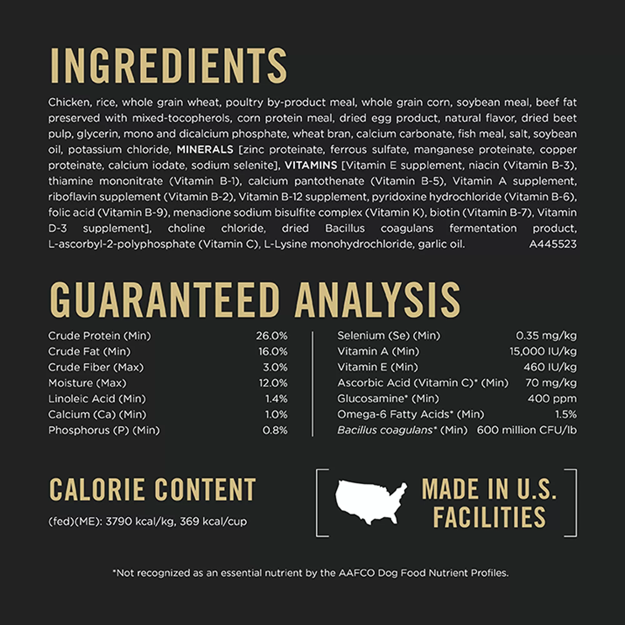 Guaranteed Analysis: Crude Protein (Min)…26.0%, Crude Fat (Min)…16.0%, Crude Fiber (Max)…3.0%, Moisture (Max)…12.0%, Linoleic Acid (Min)…1.4%, Calcium (Ca) (Min)…1.0%, Phosphorus (P) (Min)…0.8%, Selenium (Se) (Min)…0.35 mg?kg, Vitamin A (Min)…15,000 IU?kg, Vitamin E (Min)…460 IU?kg, Ascorbic Acid (Vitamin C)* (Min)…70 mg?kg, Glucosamine* (Min)…400 ppm, Omega?6 Fatty Acids* (Min)…1.5%, Bacillus coagulans* (Min)…600 million CFU?lb *Not recognized as an essential nutrient by the AAFCO Dog Food Nutrient Profiles.