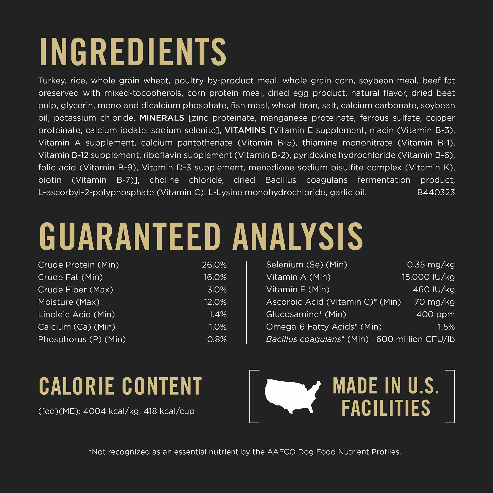 Offer your dog outstanding nutrition and great taste with Purina Pro Plan COMPLETE ESSENTIALS Shredded Blend Turkey and Rice adult dry dog food. A combination of crunchy dog food kibble and tender, shredded pieces delivers delicious taste and texture. Real turkey is the number 1 ingredient, laying the foundation for a super premium shredded dog food. Made with no artificial colors or flavors, this tender dog food includes high-quality ingredients carefully chosen for a specific nutritional or functional purpose. We use sunflower oil, rich in omega-6 fatty acids, and vitamin A to help maintain his skin and coat. Guaranteed live probiotics for dogs help promote his digestive health, and natural prebiotic fiber in our digestive dog food also nourishes beneficial intestinal bacteria. Our high quality dog food with rice is highly digestible to ensure optimal nutrient delivery, and it contains no artificial colors or flavors to meet your ingredient preferences. Every serving contains high levels of protein to help your dog maintain his ideal body condition. With Purina Pro Plan COMPLETE ESSENTIALS, your adult dog gets a complete and balanced dog food that provides exceptional nutrition to support his health.