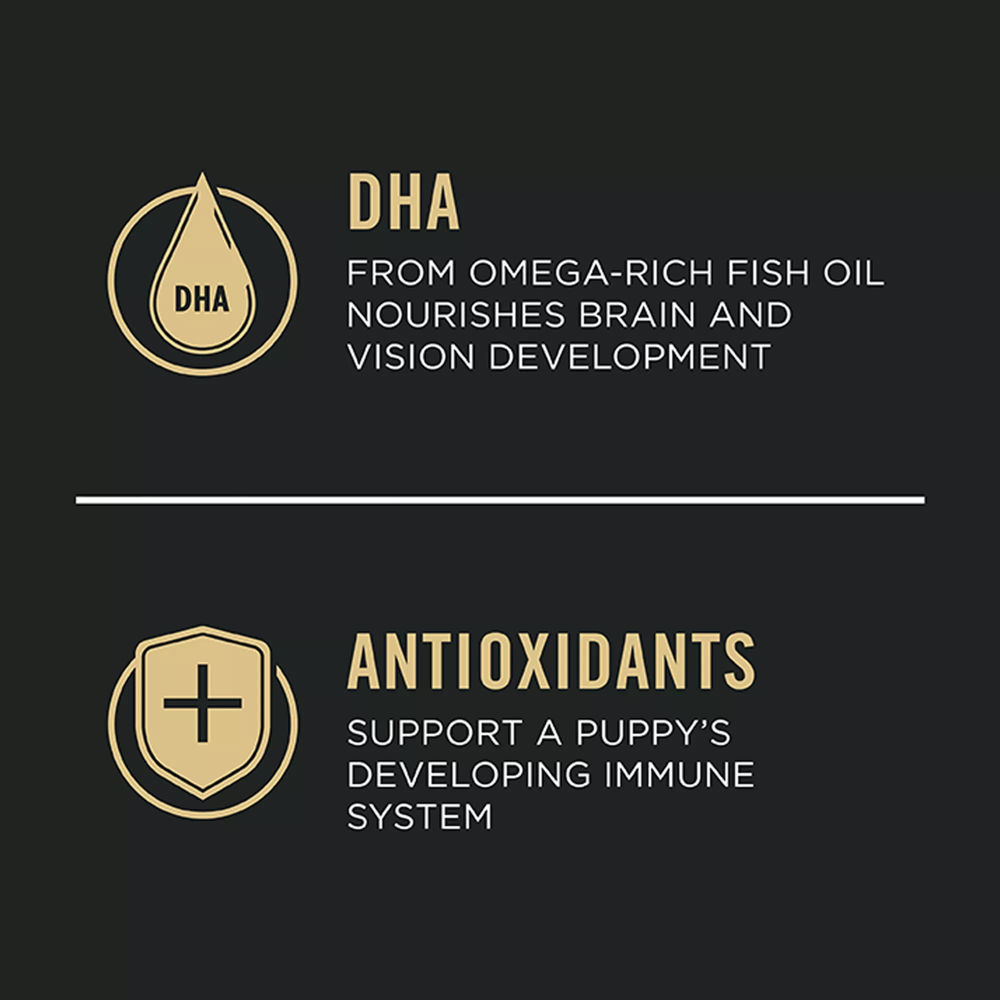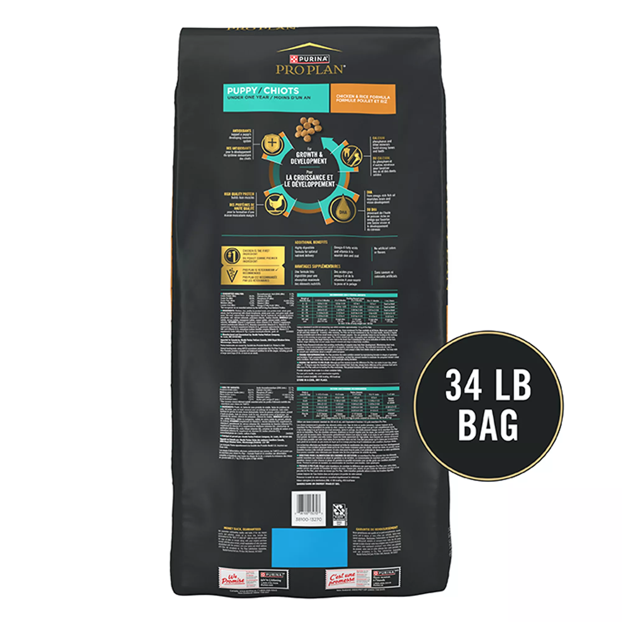 Features & Benefits: DHA from omega?rich fish oil nourishes brain and vision development, High quality protein builds lean muscles, with chicken as the first ingredient, Antioxidants support a puppy’s developing immune system, Highly digestible formula for optimal nutrient delivery, Calcium, phosphorus and other minerals build strong bones and teeth, Vitamin A and omega?6 fatty acids to nourish skin and coat, Manufactured in U.S. Facilities, Spoil your pet with Purina products. Reward yourself with points on every purchase. Download the myPurina app today.