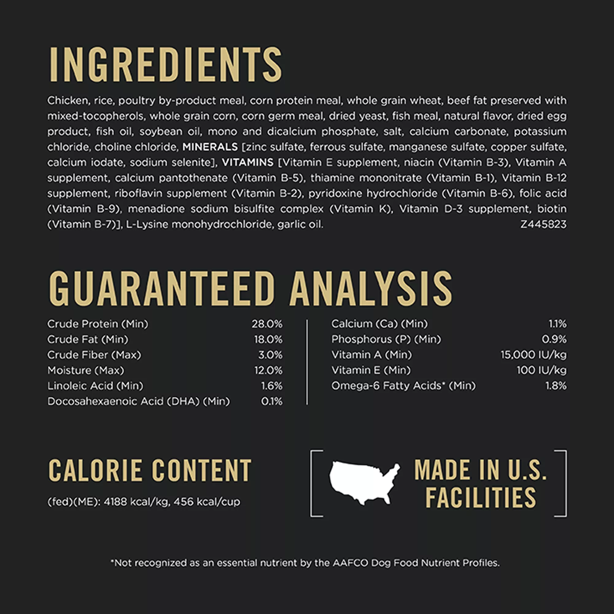 Guaranteed Analysis: Crude Protein (Min)…28.0%, Crude Fat (Min)…18.0%, Crude Fiber (Max)…3.0%, Moisture (Max)…12.0%, Linoleic Acid (Min)…1.6%, Docosahexaenoic Acid (DHA) (Min)…0.1%, Calcium (Ca) (Min)…1.1%, Phosphorus (P) (Min)…0.9%, Vitamin A (Min)…15,000 IU?kg, Vitamin E (Min)…100 IU?kg, Omega?6 Fatty Acids* (Min)…1.8% *Not recognized as an essential nutrient by the AAFCO Dog Food Nutrient Profiles.