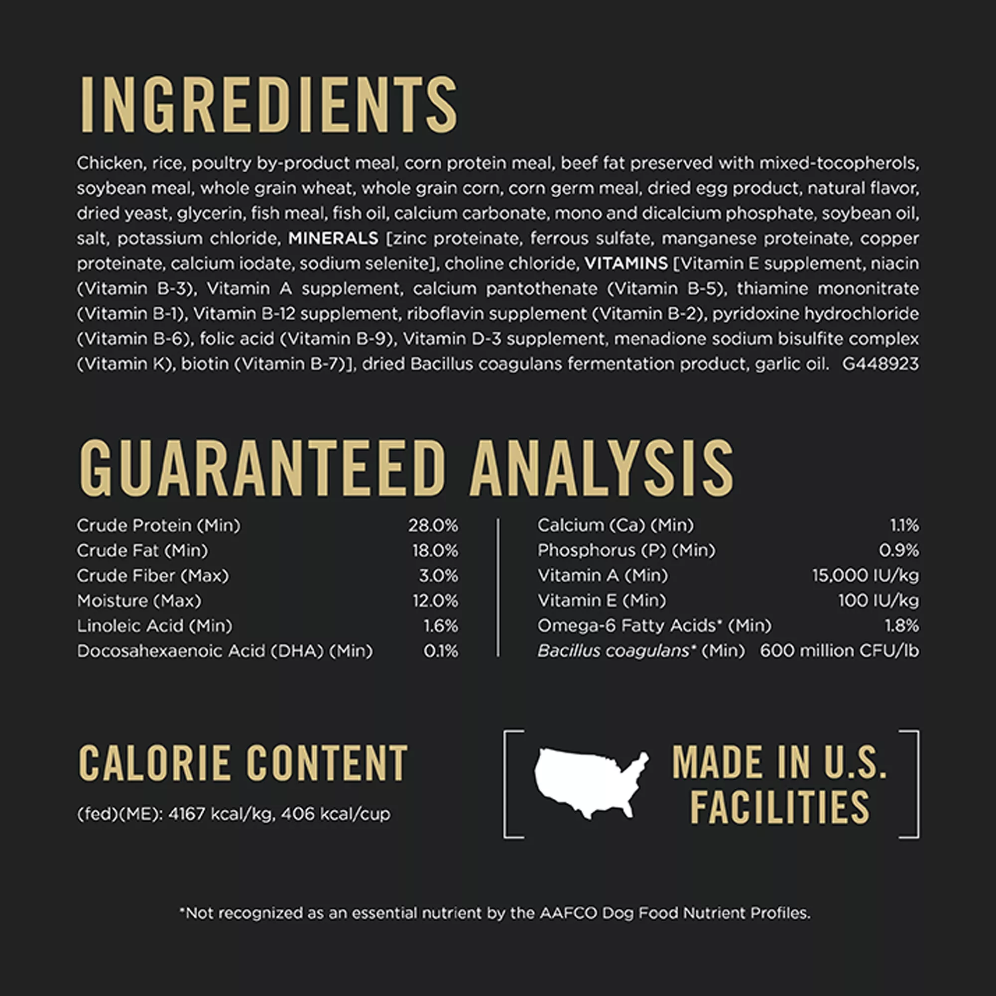 Ingredients: Chicken, Rice, Poultry By?Product Meal, Corn Protein Meal, Beef Fat Preserved With Mixed?Tocopherols, Soybean Meal, Whole Grain Wheat, Whole Grain Corn, Corn Germ Meal, Dried Egg Product, Natural Flavor, Dried Yeast, Glycerin, Fish Meal, Fish Oil, Calcium Carbonate, Mono And Dicalcium Phosphate, Soybean Oil, Salt, Potassium Chloride, MINERALS [Zinc Proteinate, Ferrous Sulfate, Manganese Proteinate, Copper Proteinate, Calcium Iodate, Sodium Selenite], Choline Chloride, VITAMINS [Vitamin E Supplement, Niacin (Vitamin B?3), Vitamin A Supplement, Calcium Pantothenate (Vitamin B?5), Thiamine Mononitrate (Vitamin B?1), Vitamin B?12 Supplement, Riboflavin Supplement (Vitamin B?2), Pyridoxine Hydrochloride (Vitamin B?6), Folic Acid (Vitamin B?9), Vitamin D?3 Supplement, Menadione Sodium Bisulfite Complex (Vitamin K), Biotin (Vitamin B?7)], Dried Bacillus Coagulans Fermentation Product, Garlic Oil. G448923