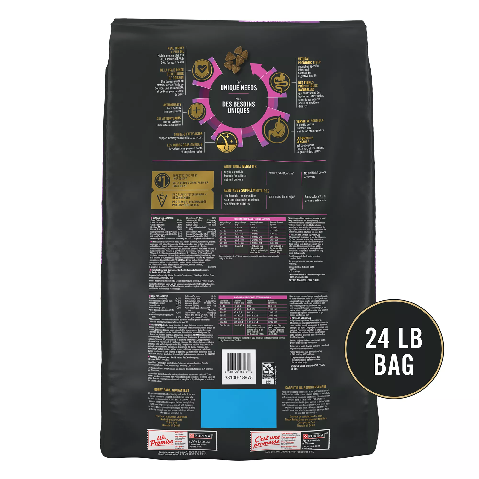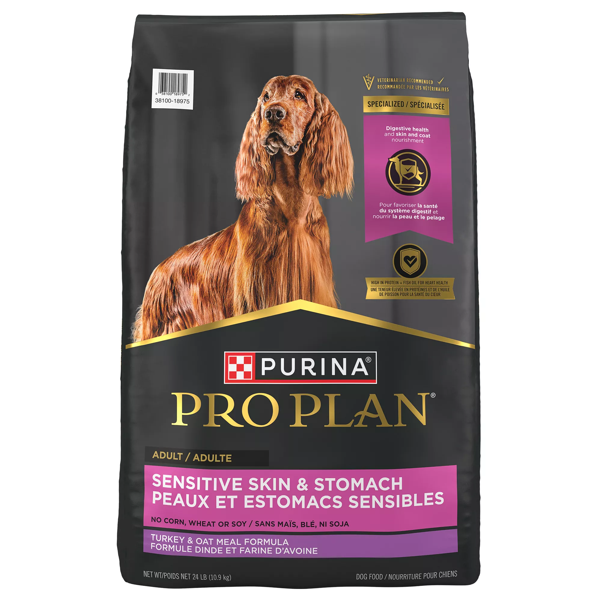 Nourish your dog’s skin and coat and help support his digestive health with Purina Pro Plan SPECIALIZED Sensitive Skin & Stomach Turkey & Oat Meal Formula adult dry dog food. Real turkey is the #1 ingredient in this wholesome, high protein dog food, and real oatmeal is easy to digest and gentle on his sensitive stomach. Sunflower oil provides a rich source of omega-6 fatty acids to support his skin and coat, and omega-3 fatty acids from fish oil and glucosamine promote mobility and joint health for dogs. Our pet nutritionists fortify our sensitive stomach dog food with guaranteed live dog probiotics to support healthy digestion and include natural prebiotic fiber to promote beneficial intestinal bacteria. Highly digestible for optimal nutrient delivery, our dry dog food for skin and coat care helps your pal get the maximum benefits from every serving. Plus, antioxidants in this dog food kibble help support a healthy immune system. You can feel confident filling your dog’s bowl knowing our complete and balanced adult dog food for sensitive skin has no corn, wheat, soy, or artificial colors or flavors to meet your ingredient preferences. We produce this sensitive skin dog food with pride in Purina-owned, U.S. facilities for quality and safety.
