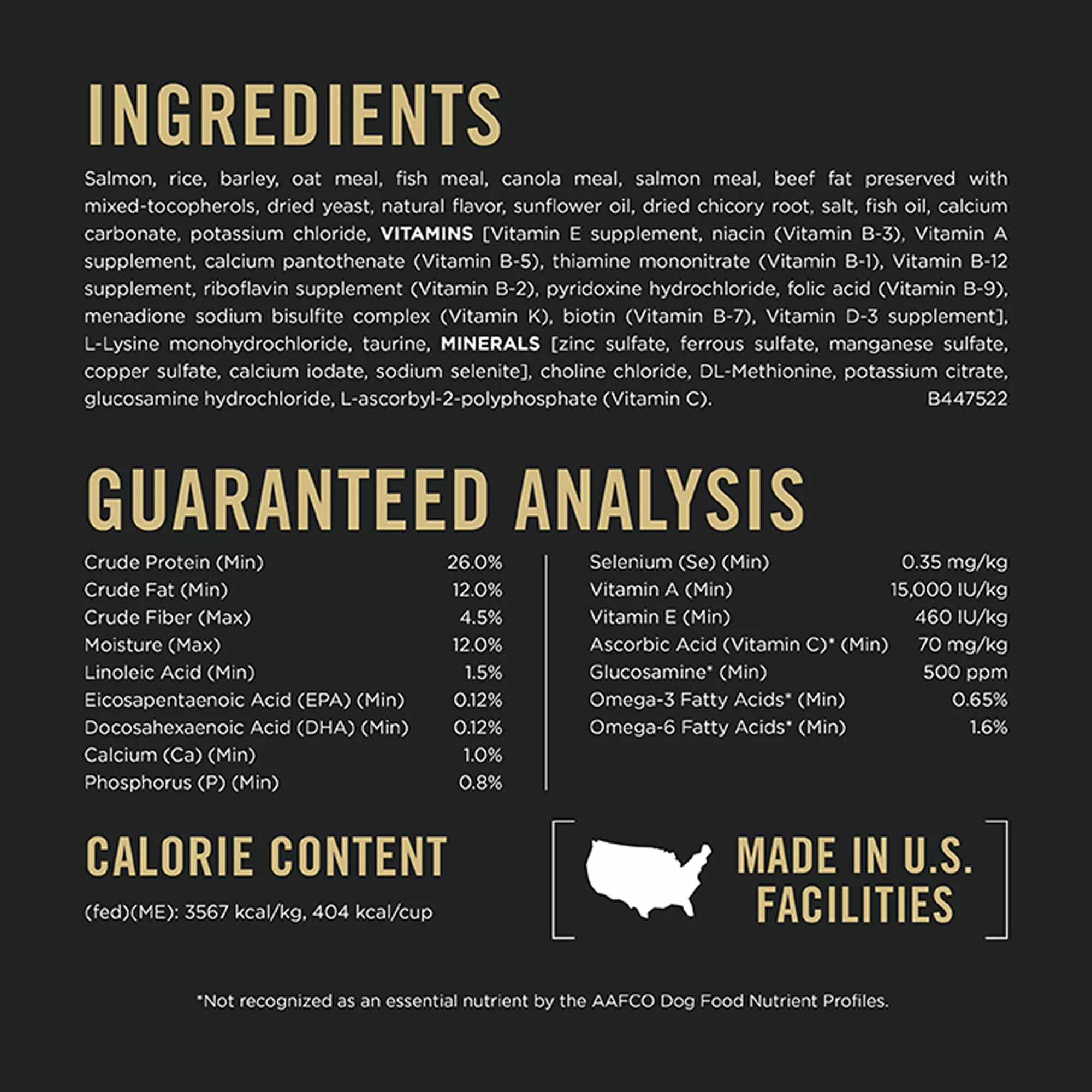 Guaranteed Analysis: Crude Protein (Min)…26.0%, Crude Fat (Min)…12.0%, Crude Fiber (Max)…4.5%, Moisture (Max)…12.0%, Linoleic Acid (Min)…1.5%, Eicosapentaenoic Acid (EPA) (Min)…0.12%, Docosahexaenoic Acid (DHA) (Min)…0.12%, Calcium (Ca) (Min)…1.0%, Phosphorus (P) (Min)…0.8%, Selenium (Se) (Min)…0.35 mg?kg, Vitamin A (Min)…15,000 IU?kg, Vitamin E (Min)…460 IU?kg, Ascorbic Acid (Vitamin C)* (Min)…70 mg?kg Total Glucosamine* (Min)…500 ppm, Glucosamine Hydrochloride* (Max)…520 ppm, Omega?3 Fatty Acids* (Min)…0.65%, Omega?6 Fatty Acids* (Min)…1.6%, *Not recognized as an essential nutrient by the AAFCO Dog Food Nutrient Profiles.