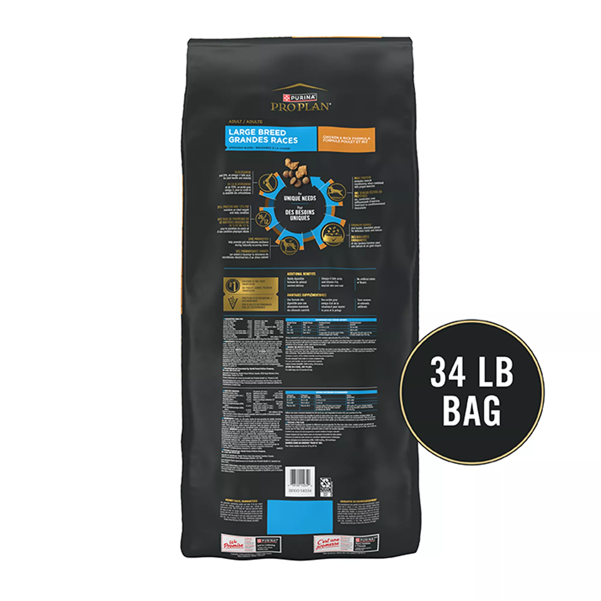Description: Give your big dog the taste he loves and 100 percent complete and balanced adult dog food nutrition with Purina Pro Plan Brand Dog Food Large Breed Shredded Blend Chicken and Rice Formula adult dry dog food. Real chicken as the first ingredient helps deliver the meaty taste he craves while giving him outstanding nutrition you can feel good about serving every day. Each serving provides optimal protein and fat levels to help maintain your dog’s lean muscles and body condition. This wholesome high protein dog food formula is fortified with guaranteed live probiotics to support his digestive and immune health, as well as natural prebiotic fiber, sourced from wheat bran. Watch as he savors every bite of this super?premium dry adult dog food formula, and take comfort knowing he’s getting the nourishment he needs at mealtime. With its combination of hard kibble and tender shredded pieces, this immune system support dry dog food delivers a pleasing texture dogs love in a formula created specifically for large breeds.