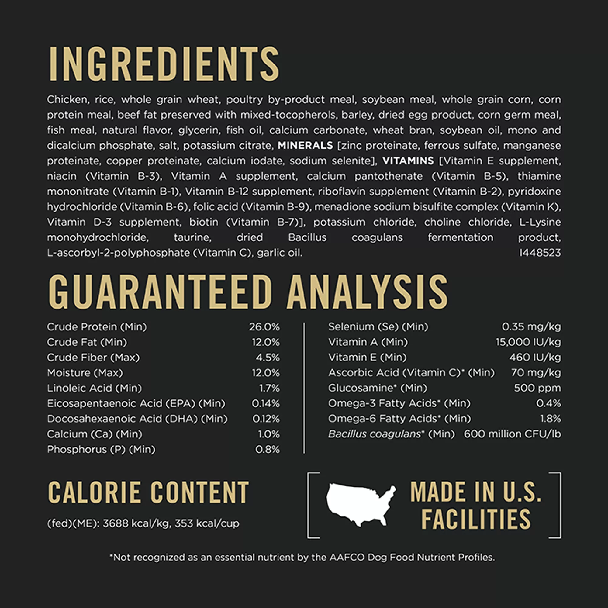 Guaranteed Analysis: Crude Protein (Min)…26.0%, Crude Fat (Min)…12.0%, Crude Fiber (Max)…4.5%, Moisture (Max)…12.0%, Linoleic Acid (Min)…1.7%, Eicosapentaenoic Acid (EPA) (Min)…0.14%, Docosahexaenoic Acid (DHA) (Min)…0.12%, Calcium (Ca) (Min)…1.0%, Phosphorus (P) (Min)…0.8%, Selenium (Se) (Min)…0.35 mg/kg, Vitamin A (Min)…15,000 IU/kg, Vitamin E (Min)…460 IU/kg, Ascorbic Acid (Vitamin C)* (Min)…70 mg/kg, Glucosamine* (Min)…500 ppm, Omega?3 Fatty Acids* (Min)…0.4%, Omega?6 Fatty Acids* (Min)…1.8%, Bacillus coagulans* (Min)…600 million CFU/lb *Not recognized as an essential nutrient by the AAFCO Dog Food Nutrient Profiles.