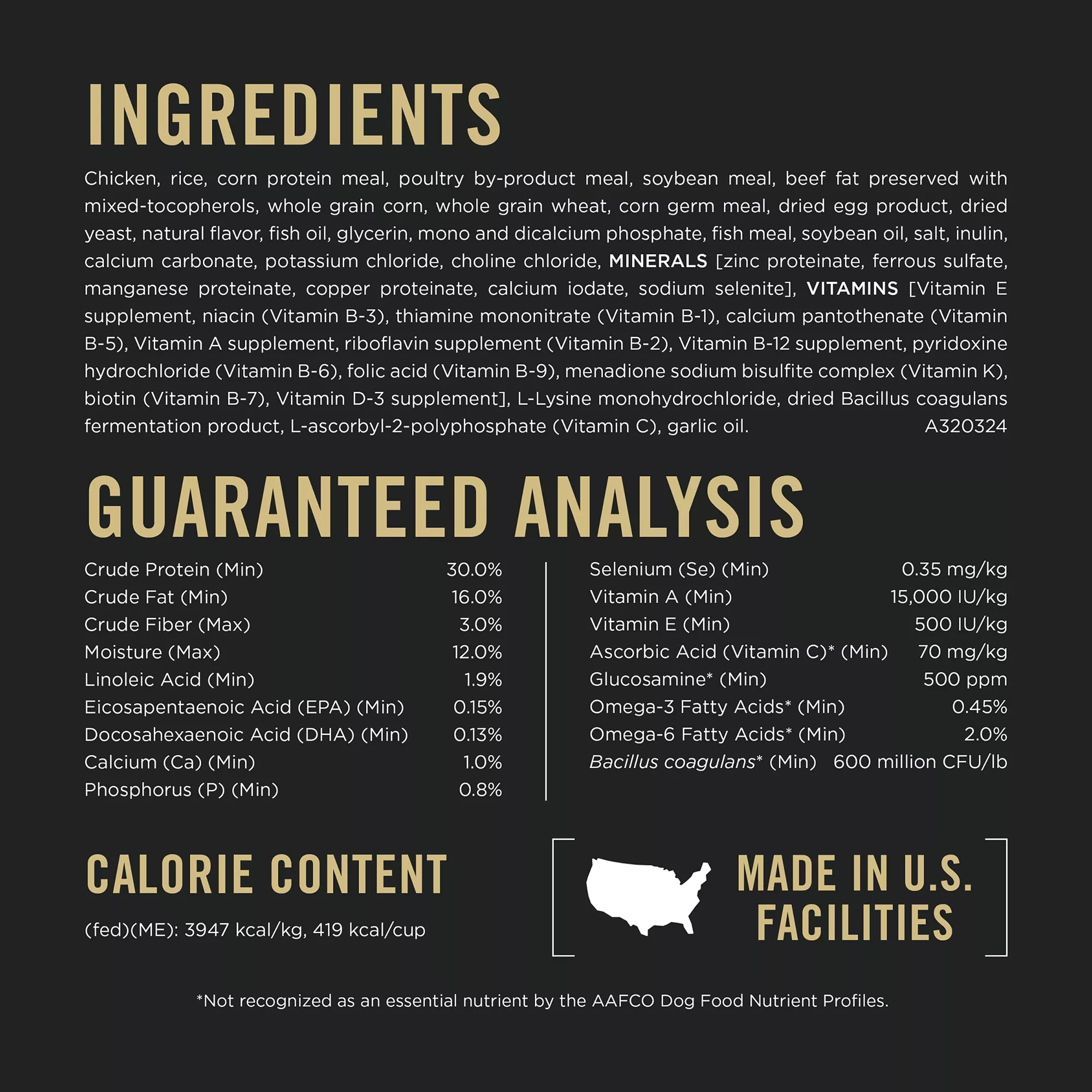 Guaranteed Analysis: Crude Protein (Min)?30.0%, Crude Fat (Min)?16.0%, Crude Fiber (Max)?3.0%, Moisture (Max)?12.0%, Linoleic Acid (Min)?1.9%, Eicosapentaenoic Acid (EPA) (Min)?0.15%, Docosahexaenoic Acid (DHA) (Min)?0.13%, Calcium (Ca) (Min)?1.0%, Phosphorus (P) (Min)?0.8%, Selenium (Se) (Min)?0.35 mg?kg, Vitamin A (Min)?15000 IU?kg, Vitamin E (Min)?500 IU?kg, Ascorbic Acid (Vitamin C) (Min)*?70 mg?kg, Glucosamine (Min)*?500 ppm, Omega?3 Fatty Acids (Min)*?0.45%, Omega?6 Fatty Acids (Min)*?2.0%, Bacillus coagulans (Min)*?600 million CFU?lb *Not recognized as an essential nutrient by the AAFCO Dog Food Nutrient Profiles.
