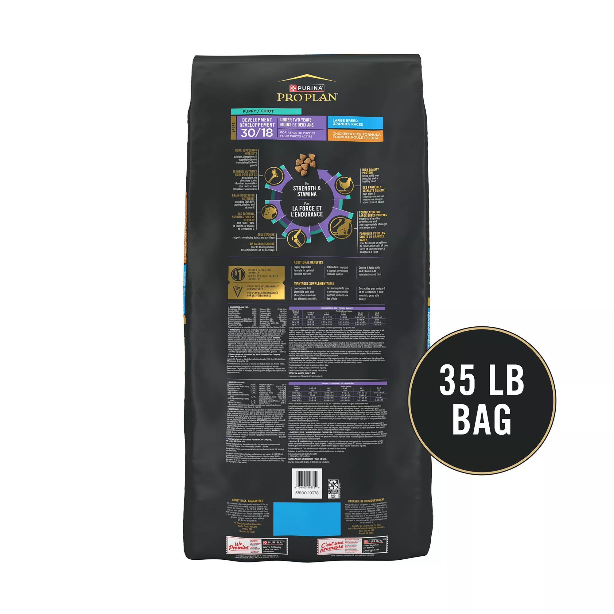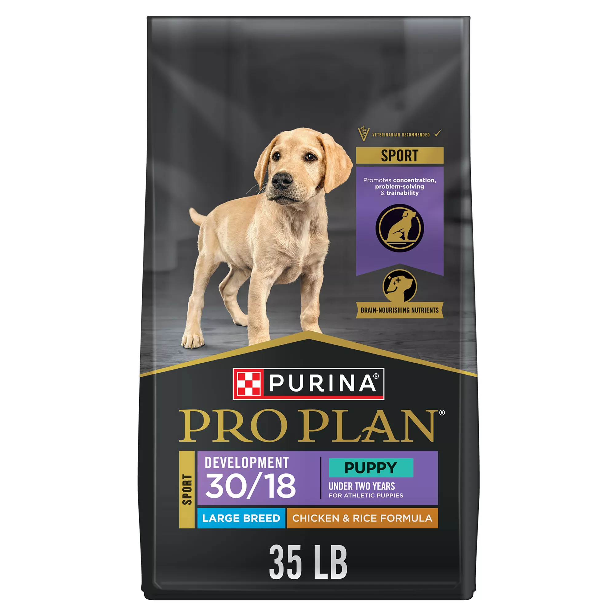 Give your large breed puppy fine-tuned nutrition for a healthy growth rate and age-appropriate strength and endurance, with Pro Plan Sport Large Breed Puppy Development 30/18 Chicken and Rice dry puppy food. Formulated for athletic large breed puppies, this large puppy food is an active dog food that promotes concentration, problem-solving and trainability for excellence in the field, in the show ring, and at home. Bone-supporting nutrients calcium, phosphorus and essential vitamins promote healthy bone growth, while this dog food with glucosamine supports joints and cartilage. Plus, this high protein dog food has real chicken as the #1 ingredient and high-quality protein to build lean muscles and a healthy heart. It also contains antioxidants for dogs to support your puppy’s developing immune system. Set the nutritional foundation they need for competitive canine athletics with Purina Pro Plan Sport dog food. It???s dry dog food for puppies that helps them live their best, active lives.