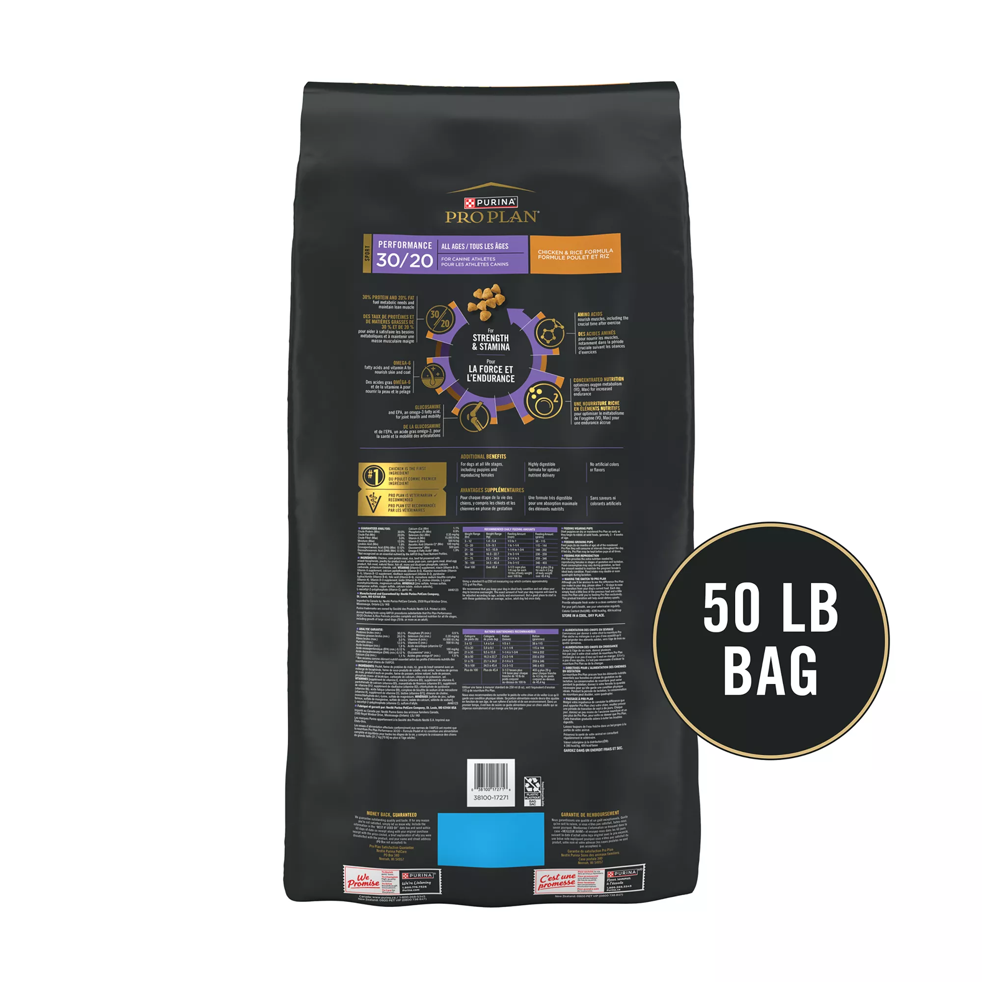 Features & Benefits: High protein dry dog food formula, with real chicken as the first ingredient and concentrated nutrition to optimize oxygen metabolism (VO2 Max) for increased endurance. Amino acids nourish muscles, including the crucial time after you’ve given your dog exercise. 30 percent protein and 20 percent fat fuel metabolic needs and maintain lean muscle, while EPA, an omega?3 fatty acid, and glucosamine for dogs help support joint health and mobility. This Purina Pro Plan dog food offers 100 percent complete and balanced nutrition for highly active dogs, including DHA, to help nourish brain and vision development. This chicken dog food recipe from a veterinarian?recommended brand is proudly manufactured in Purina?owned U.S. facilities and designed to nourish dogs in all stages of life. Spoil your pet with Purina products. Reward yourself with points on every purchase. Download the myPurina app today.