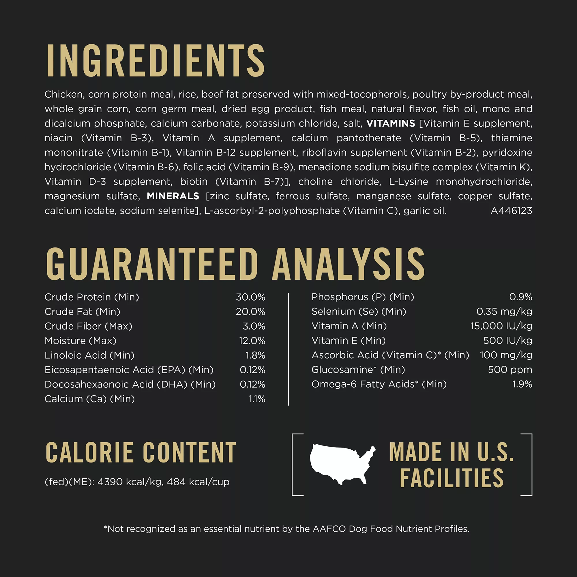 Guaranteed Analysis: Crude Protein (Min)?30.0%, Crude Fat (Min)?20.0%, Crude Fiber (Max)?3.0%, Moisture (Max)?12.0%, Linoleic Acid (Min)?1.8%, Eicosapentaenoic Acid (EPA) (Min)…0.12%, Docosahexaenoic Acid (DHA) (Min)…0.12%, Calcium (Ca) (Min)…1.1%, Phosphorus (P) (Min)…0.9%, Selenium (Se) (Min)…0.35 mg?kg, Vitamin A (Min)?15,000 IU?kg, Vitamin E (Min)?500 IU?kg, Ascorbic Acid (Vitamin C) (Min)…100 mg?kg, Glucosamine (Min)…500 ppm, Omega?6 Fatty Acids (Min)…1.9%