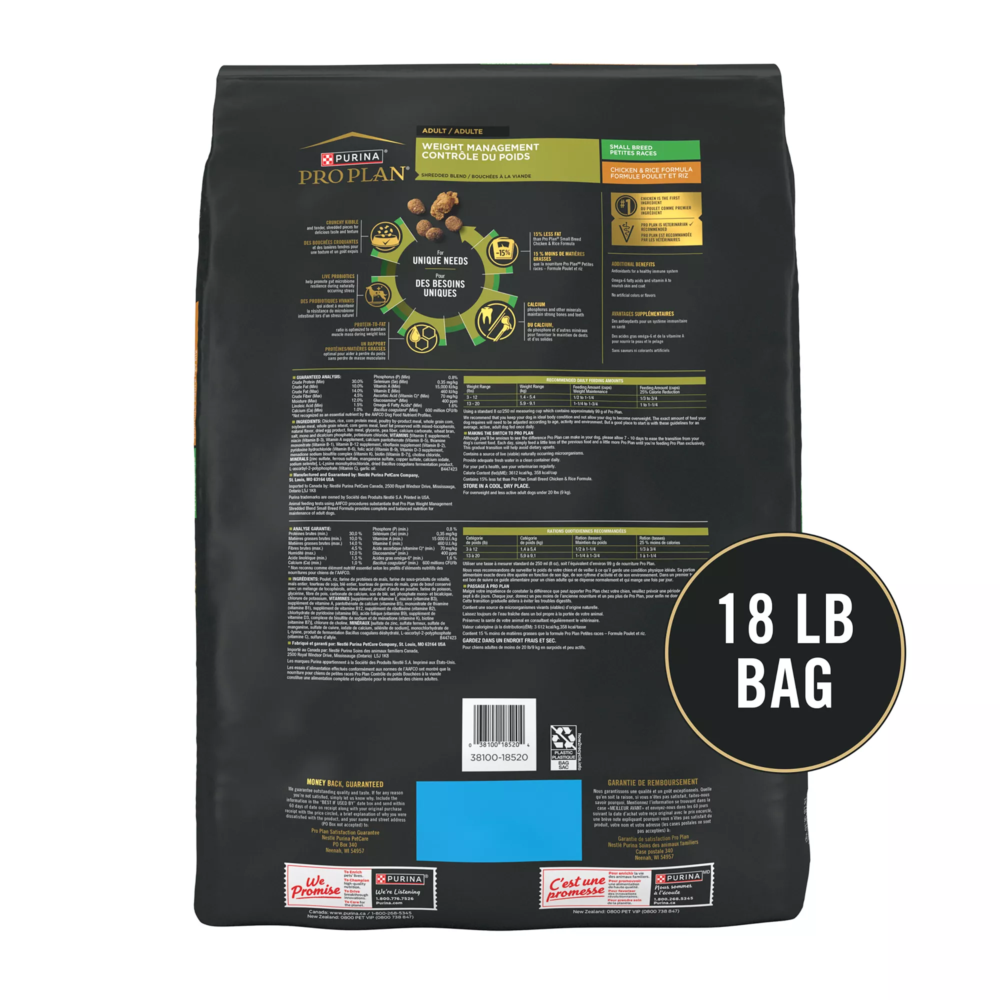 Provide the targeted support your small breed dog needs to achieve a healthy weight by feeding him Purina Pro Plan Small Breed Weight Management Shredded Blend Chicken and Rice Formula dry dog food. Real, high-quality chicken is the first ingredient in this kibble dog food, which features a high protein level to maintain lean muscle mass during weight loss. We fortify our weight control dog food with guaranteed live probiotics to support your dog’s digestive and immune health, while natural prebiotic fiber nourishes specific intestinal bacteria for digestive health. Our small breed dry dog food contains calcium, phosphorus and other minerals to maintain his strong bones and teeth, and omega-6 fatty acids and vitamin A nourish your dog’s skin and coat. The appealing combination of crunchy kibble and tender, shredded pieces provides delicious taste and texture without the use of artificial colors or flavors. Our formula provides 100 percent complete andbalanced nutrition to support his overall health. With 15 percent less fat than Purina Pro Plan Small Breed Shredded Blend Chicken and Rice Formula for adult dogs, this SPECIALIZED Small Breed Weight Management dog food formula helps your dog reach an ideal body condition. We proudly manufacture Pro Plan dry dog food at Purina-owned facilities for your peace of mind.