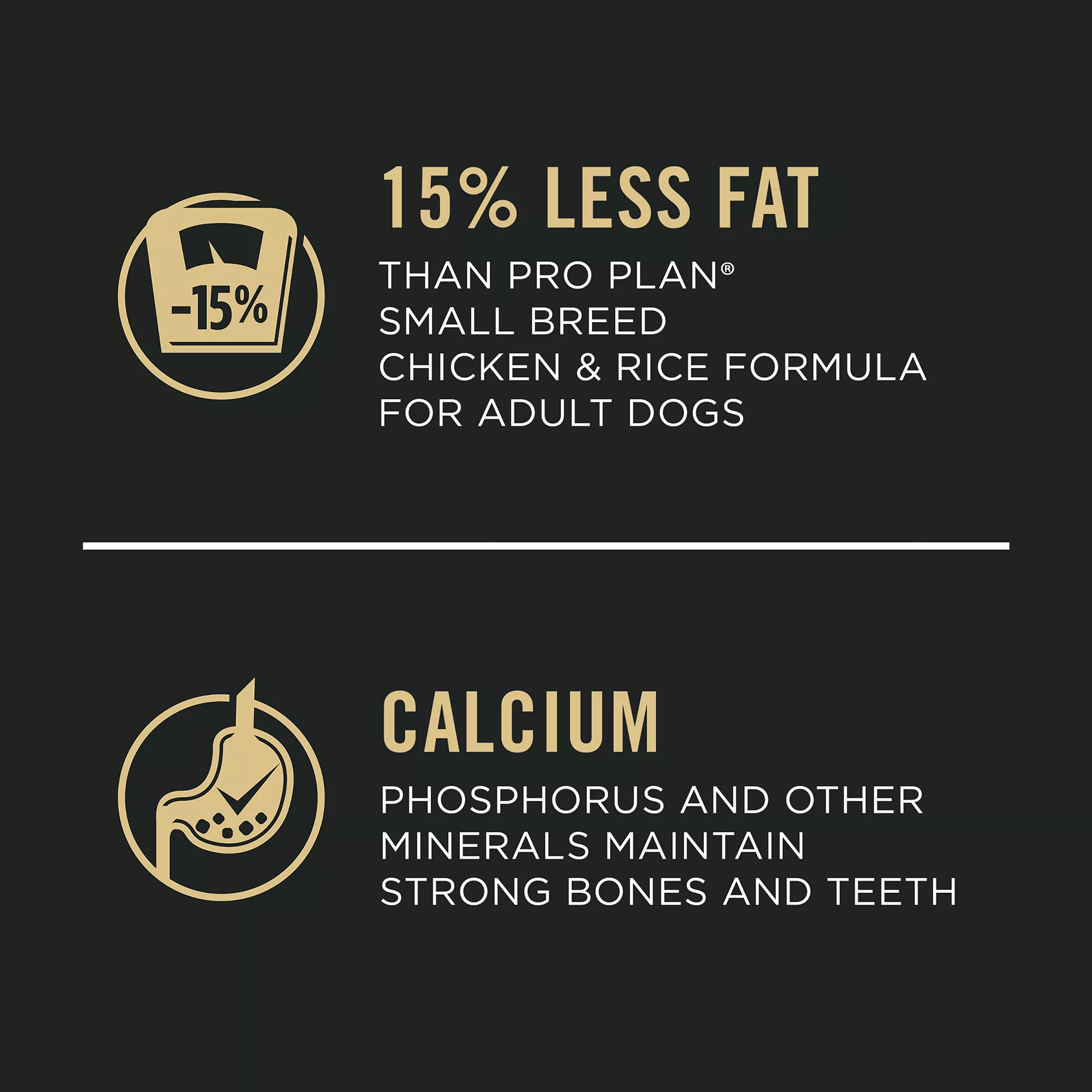 15 percent less fat than Pro Plan Small Breed Shredded Blend Chicken and Rice Formula for dogs