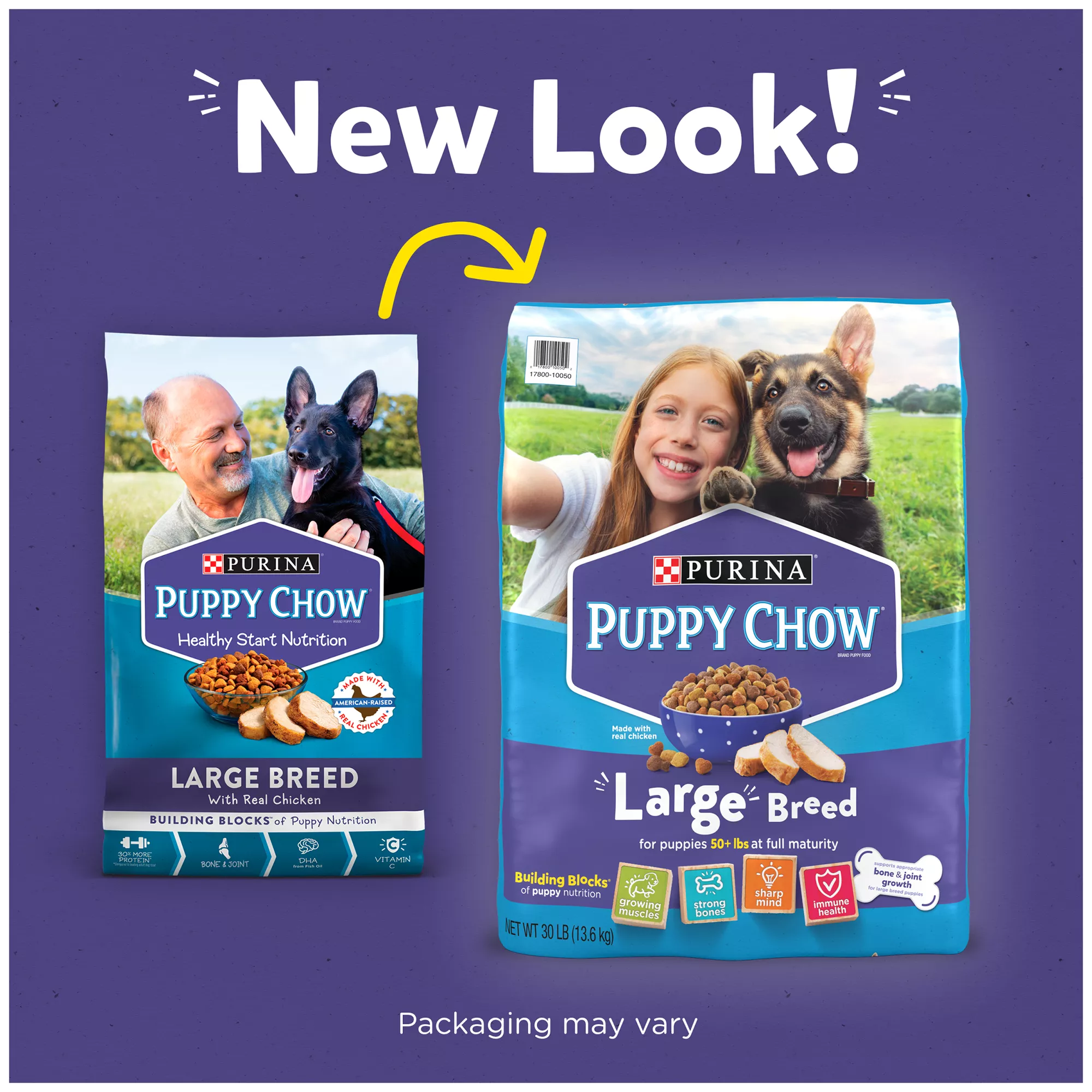 Give your puppy the nutrition he needs to grow into his big paws with Purina Puppy Chow Large Breed Formula dry dog kibble. Your adorable, playful puppy has unique nutritional needs during the first two years of his life, and this large breed dog food is formulated to meet those needs and to support him from the inside out. Each serving of crunchy high protein dog food comes packed with 30 percent more protein than the leading adult formula for his growing muscles, and it is carefully crafted to help support your puppy through those early years of development. With antioxidants like Vitamin C, 100 percent of essential nutrients, including DHA, and a Puppy Chow dog food taste puppies love, this recipe lets you care for his overall health and happiness in one convenient dry dog food large breed recipe. Feed your growing large breed puppy according to the serving instructions based on his weight and give him the foundation he needs to lead a healthy, active lifewith you by his side.