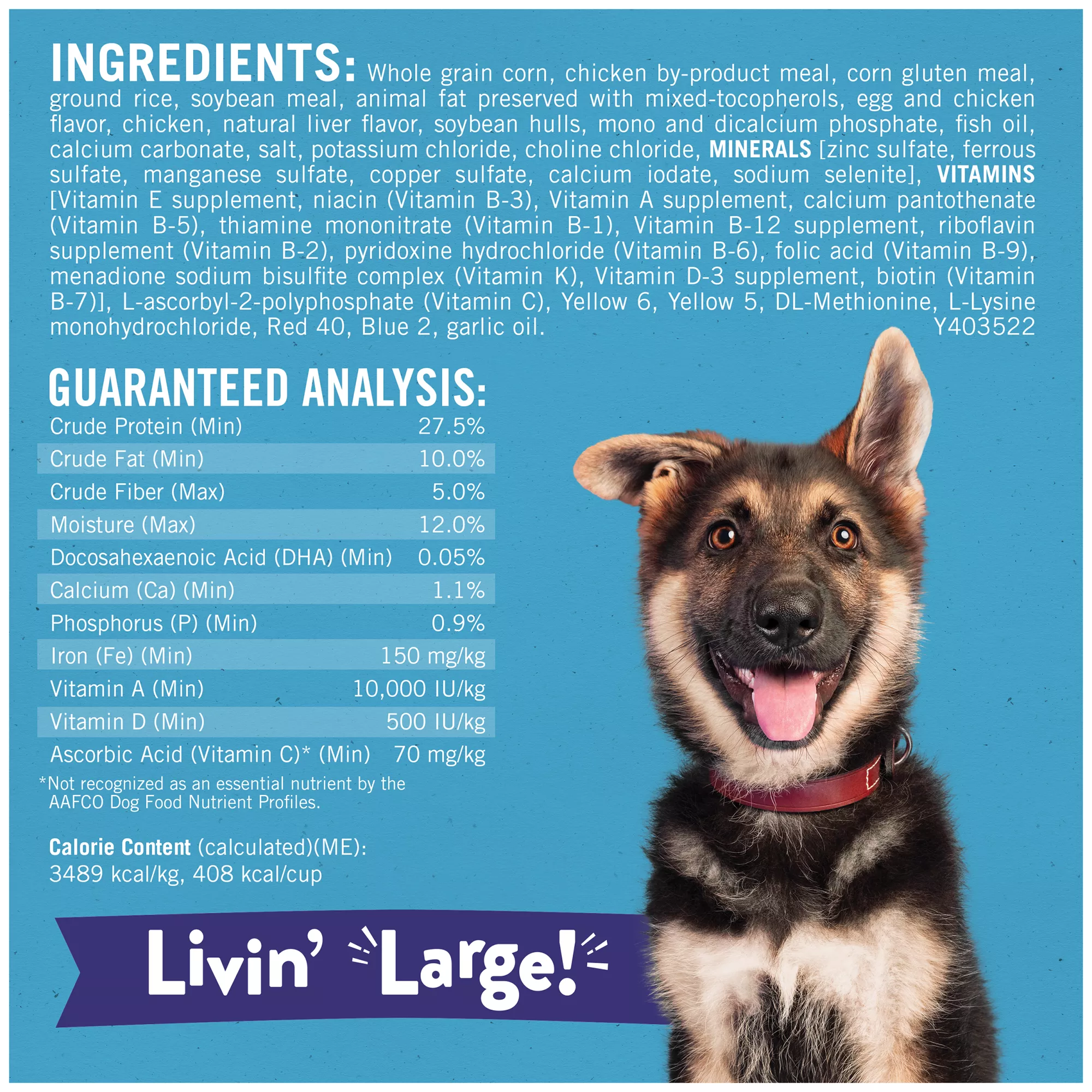 High protein dog food featuring 27.5 percent protein for growing muscles and essential vitamins and minerals, including calcium for healthy bones and teeth