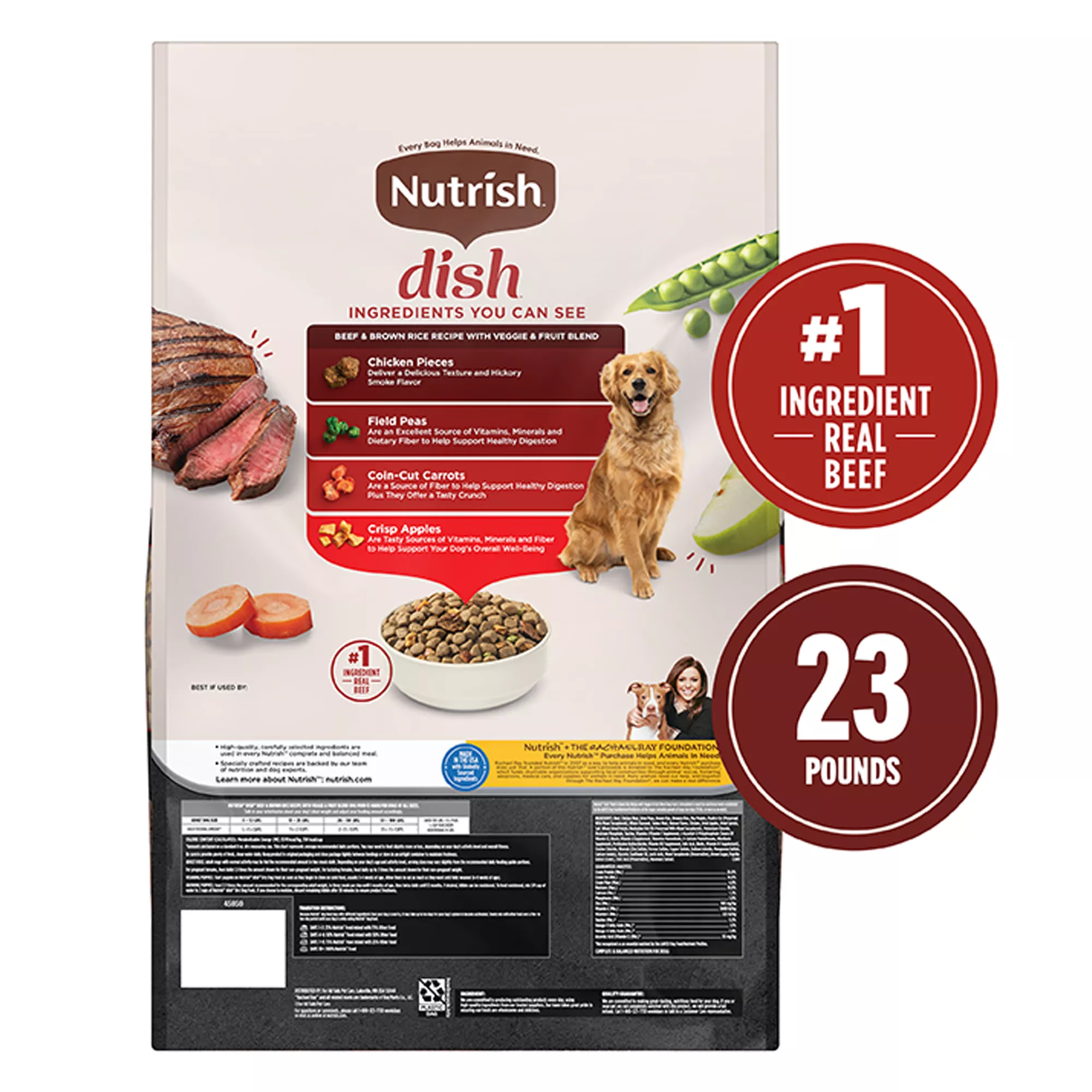 Contains one (1) 23 lb bag of Rachael Ray Nutrish Dish Beef and Brown Rice dry dog food (packaging may vary)