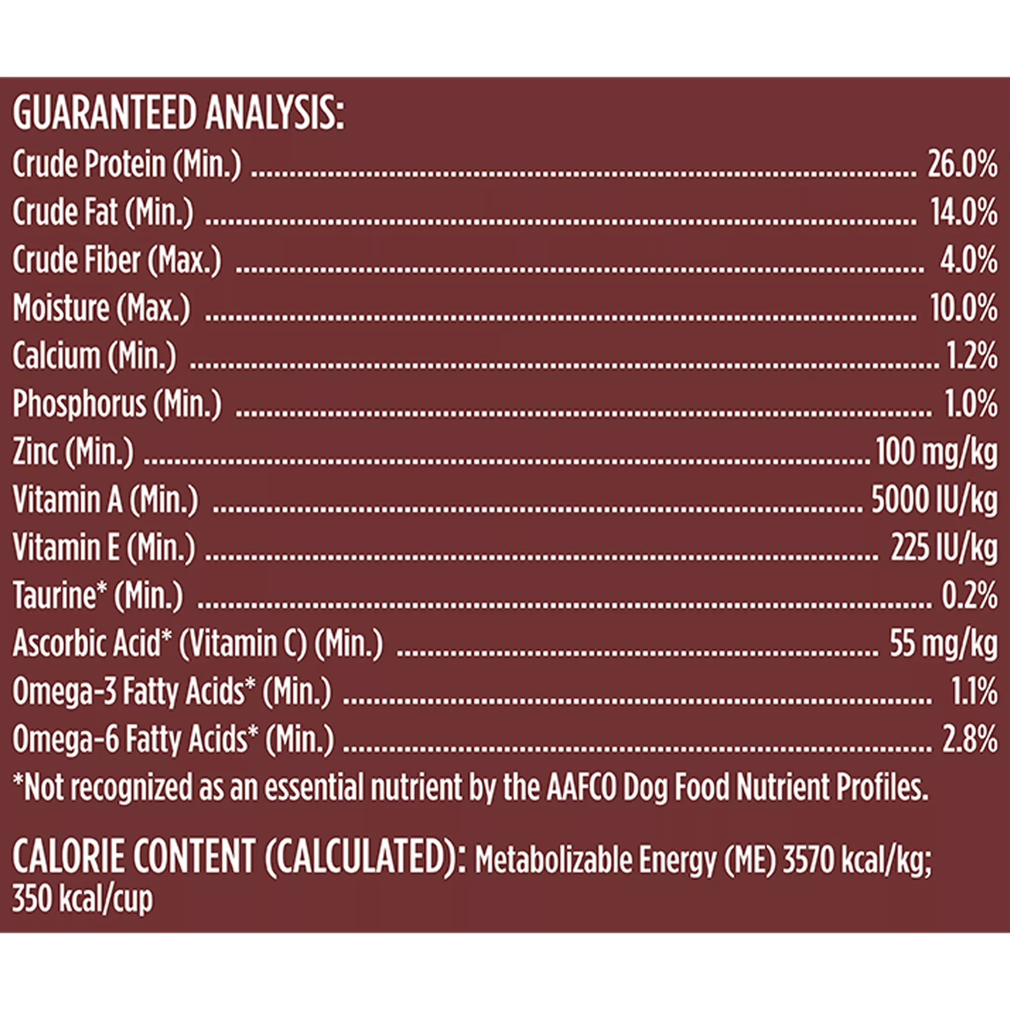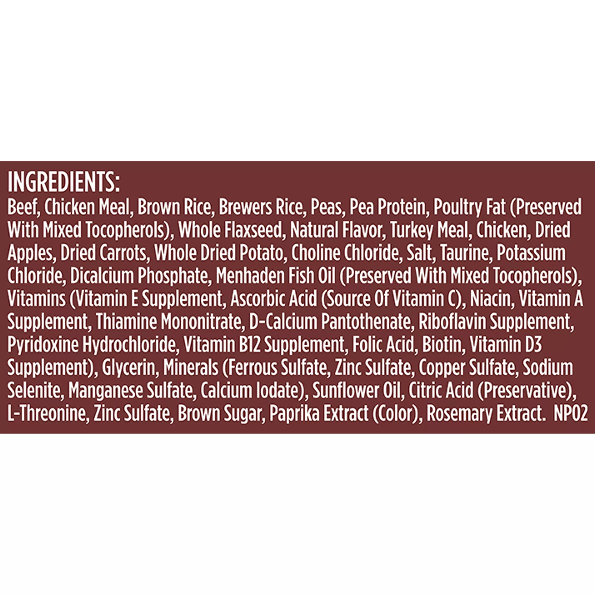 Nutritional Benefits: Real Beef #1 Ingredient, No added corn, wheat, soy or gluten, No poultry by-product meal or fillers, No artificial flavors or artificial preservatives, REAL CHICKEN PIECES are slow roasted with a real delicious meat texture and hickory smoke flavor that your dog will love, COIN-CUT CARROTS are a source of fiber that help support healthy digestion plus they offer a tasty crunch your dog will love, FIELD PEAS are excellent sources of vitamins & minerals, dietary fiber to help support healthy digestion, CRISP APPLES are a tasty fruit that contain fiber & minerals which help support your dog???s overall well-being, REAL BEEF is always the #1 ingredient which helps support healthy organs and maintain lean muscle mass. It is also a good source of protein, BROWN RICE is a carbohydrate, which is low in fat but high in fiber which helps support healthy digestion. It is a good source of energy, POULTRY FAT & WHOLE FLAXSEED are naturally rich sources of Omega-6 and Omega-3 fatty acids which help support a healthy skin and coat, NEVER ANY: added corn, wheat, soy or gluten, poultry by-product meal or fillers, or artificial flavors or artificial preservatives