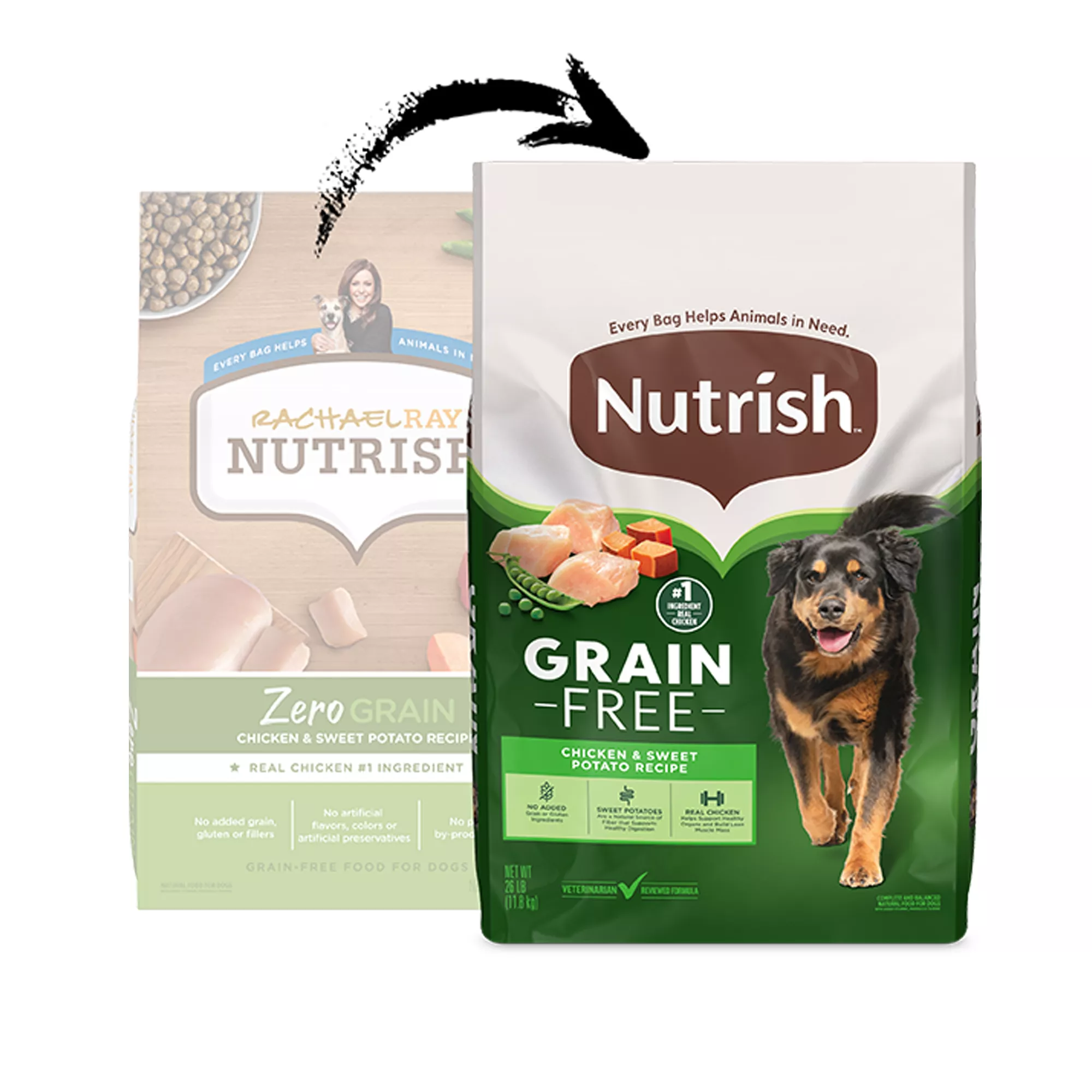 Give your dog a zero-guilt meal they’ll love with Rachael Ray Nutrish Zero Grain Chicken & Sweet Potato Recipe. This grain-free dry dog food is made with real chicken as the #1 ingredient to delight your dog with tasty chicken in every bowl. We also added vitamins, minerals and taurine. What didn’t make it into our recipe? Grain, gluten, filler ingredients, poultry by-product meal, artificial flavors, colors or preservatives….