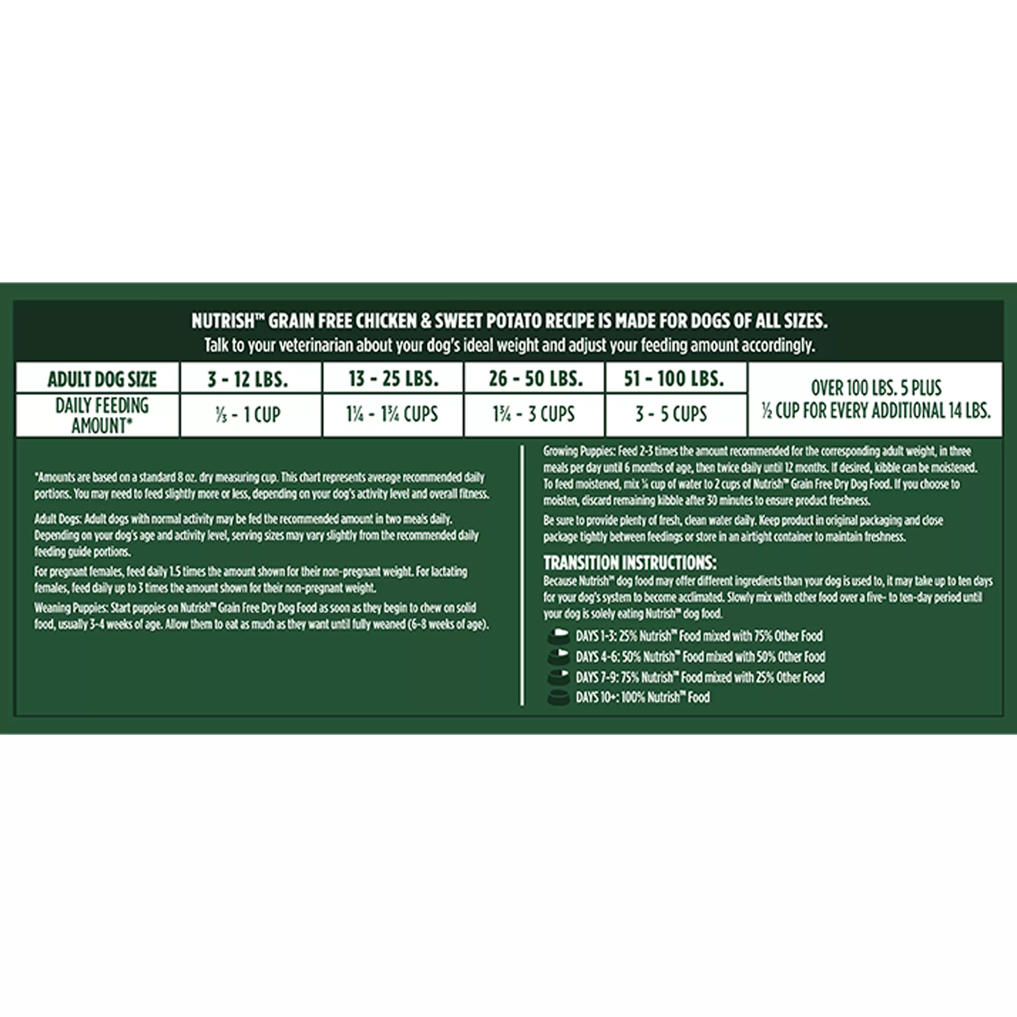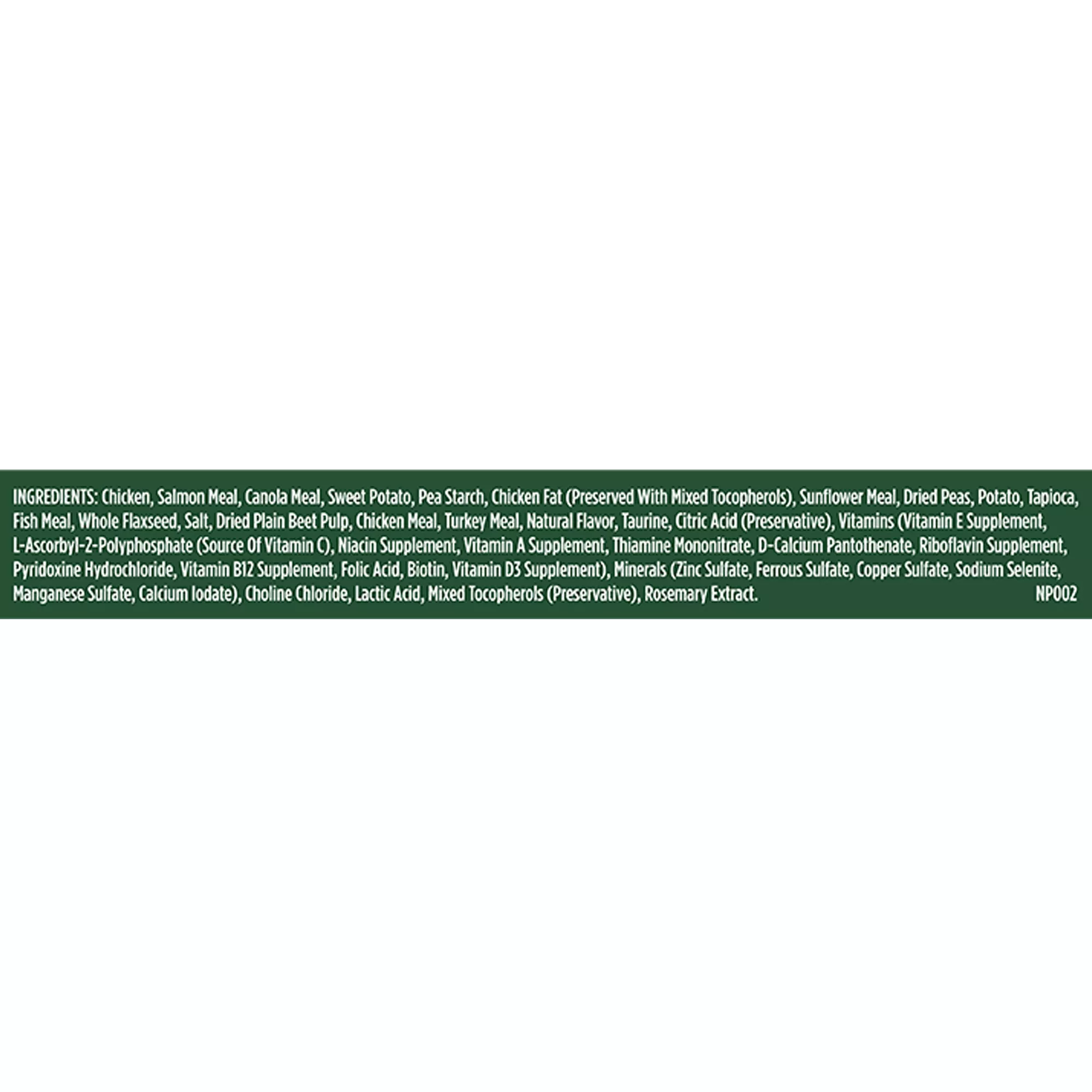 Nutritional Benefits: Grain-Free Food For Dogs, No added grains, gluten or fillers, No artificial flavors, colors or artificial preservatives, No poultry by-product meal, Natural Food for Dogs with added vitamins, minerals & taurine, REAL CHICKEN is always the #1 ingredient which helps support healthy organs and build lean muscle mass, CHICKEN MEAL is a naturally rich source of essential amino acids and Omega 6 fatty acid to help support a healthy skin and coat. It is also a natural source of Glucosamine and Chondroitin which are the building blocks of healthy joints, SWEET POTATOES are an excellent natural source of fiber. They’re also a tasty option that’s naturally gluten-free, BEET PULP is a wholesome fiber source which helps support healthy digestion, WHOLE FLAXSEED & CHICKEN FAT are naturally rich sources of Omega 6 and Omega 3 fatty acids which help support a healthy skin and coat,